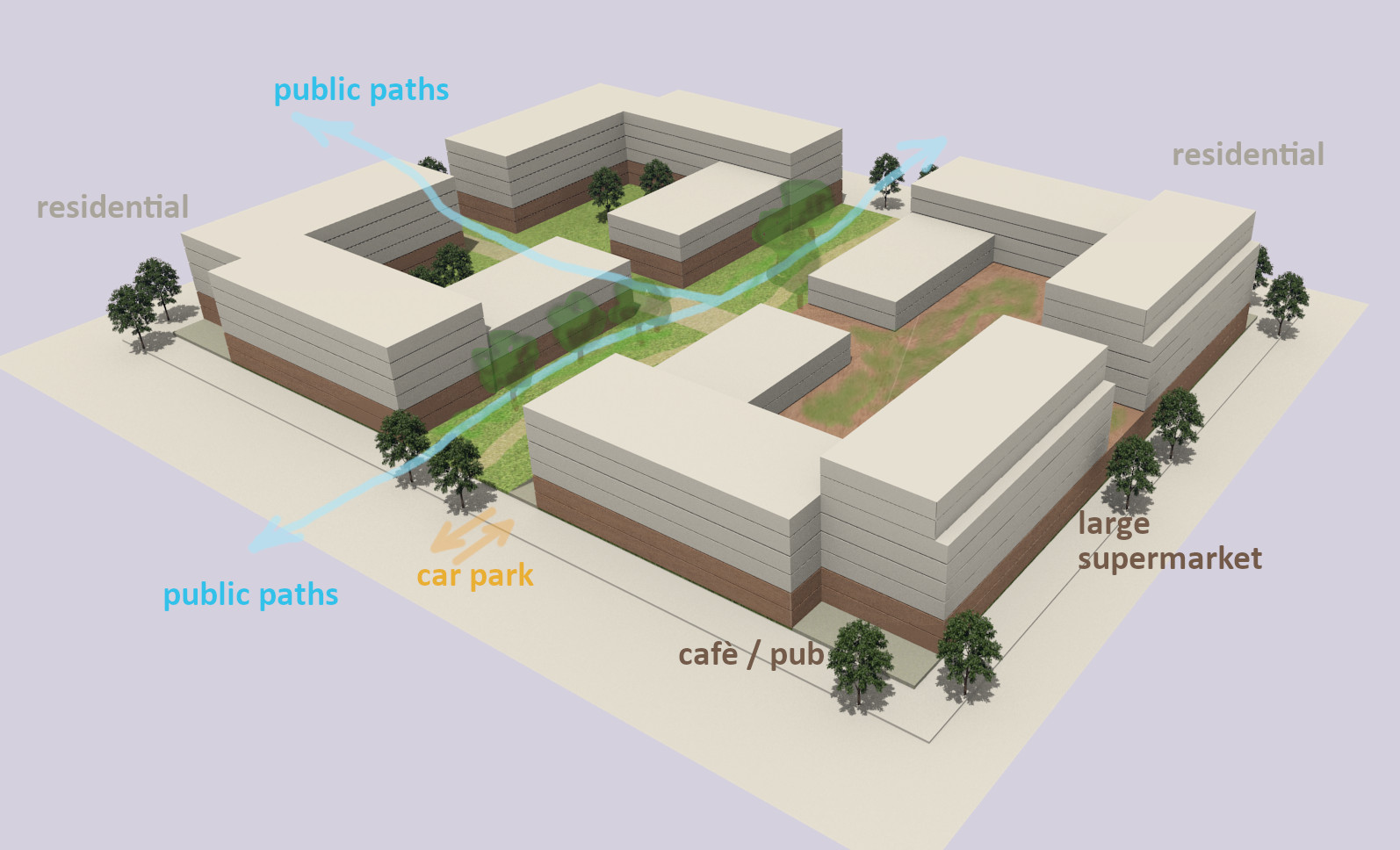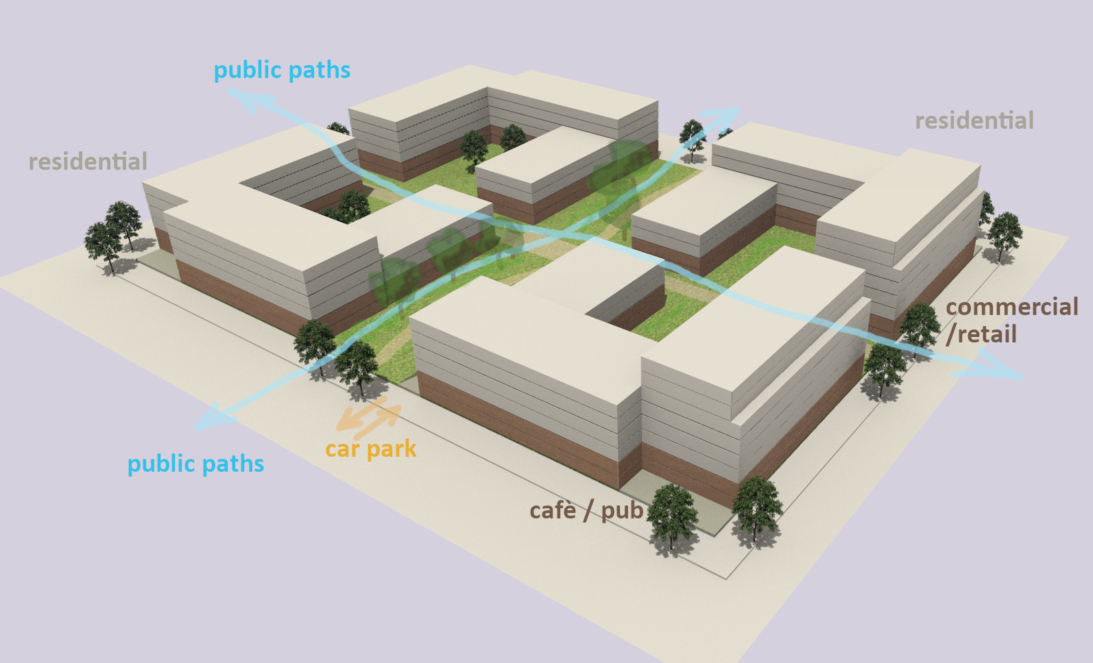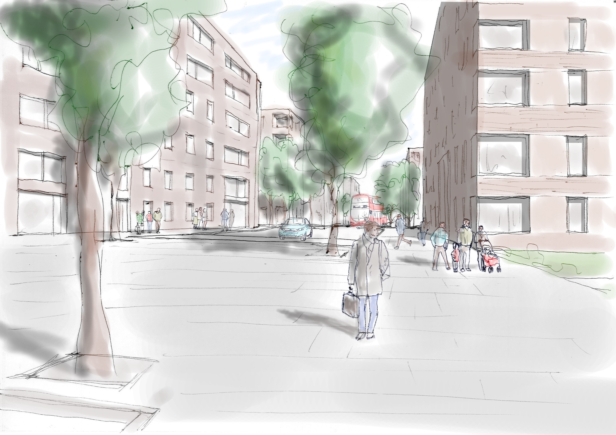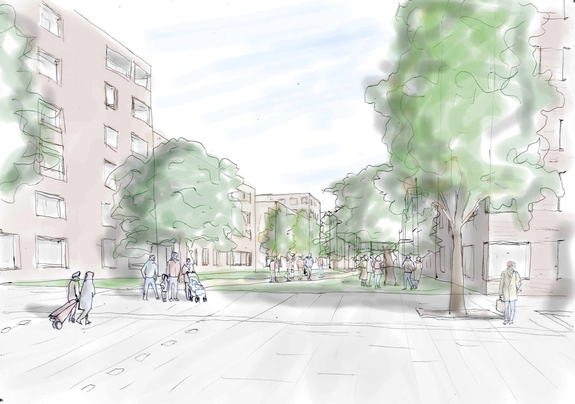 The proposed layout of streets and blocks, which will provide a total of more than 4,000 new homes, is modelled on successful examples of cities with a dense residential population, such as Barcelona. It is offered as an alternative to high-rise blocks surrounded by open space. The layout would be flexible and responsive to changing social and economic conditions. Streets would be wide, with extra space for pocket parks or cafes at junctions. Pavements would be generous, with space for on-street parking. At pedestrian crossing points the pavement would be widened and paving would give pedestrians and cyclists priority. There would be space for large trees. Some streets would be traffic-free and landscaped to create a network of routes for pedestrians and cyclists. Building heights would range from8-storeys in the main east-west street,which could be lined with a mix of large and small retail units. Other streets would be 6-storeys or 4-storeys. Dual aspect residential units would be arranged around landscaped internal courts and roof terraces.