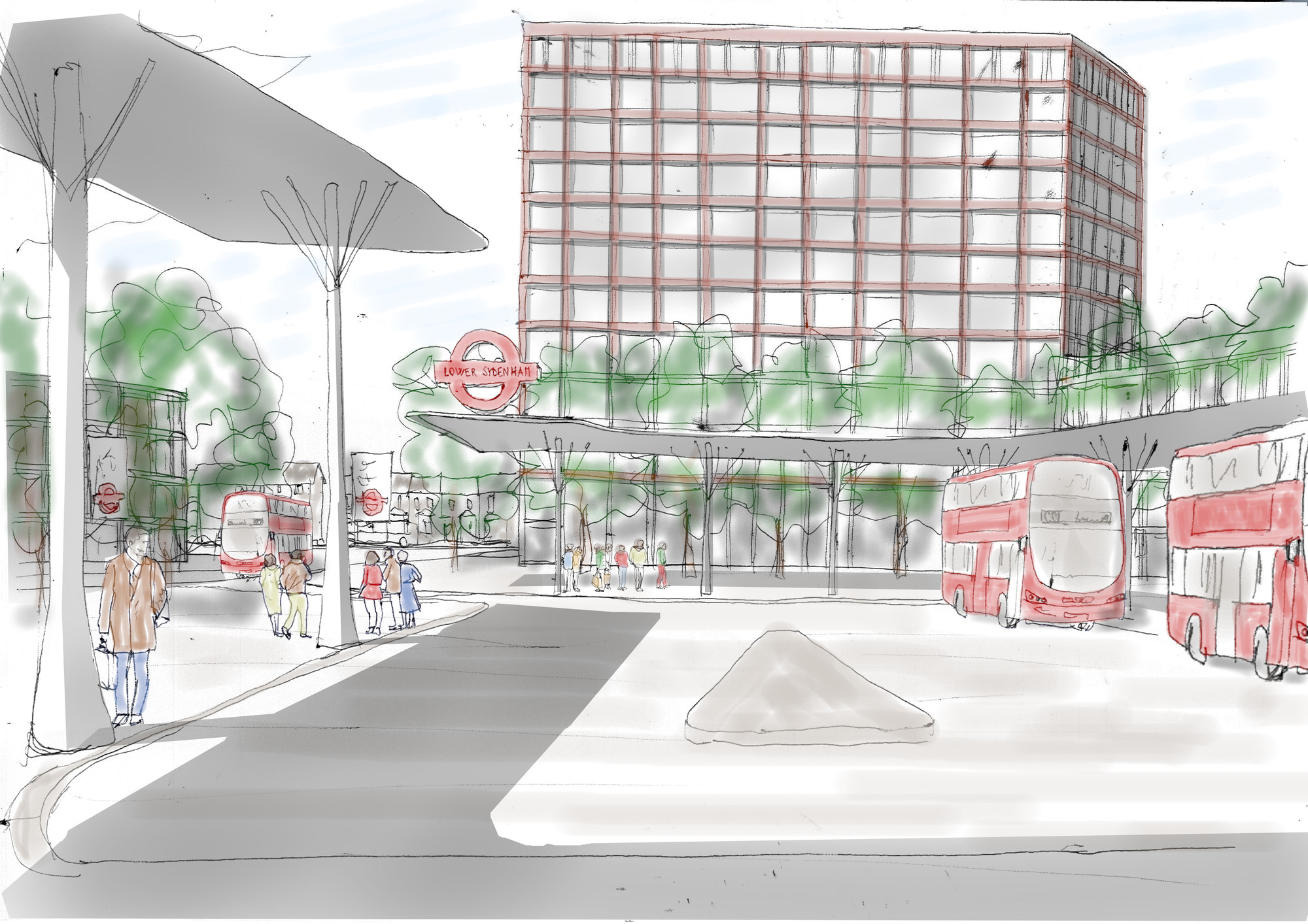 It is proposed to relocate Lower Sydenham Station to the south east corner of the site, next to the new bus station. This will allow the pavement and road to be widened where Southend Lane passes under the railway bridge.Increasing the height of the bridges lightly would enable double-decker bus routes to extend in all directions. Taller10-12 storey blocks would be arranged around the new transport hub. These could include facilities like a health centre, children’s nursery, as well as commercial uses such as hotels and offices.