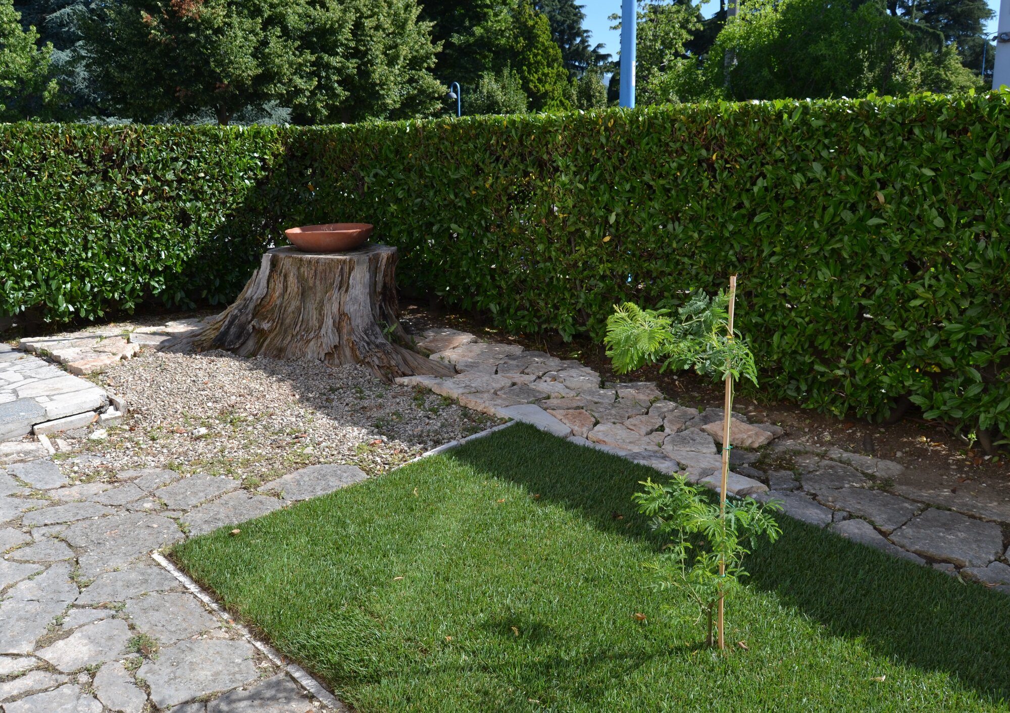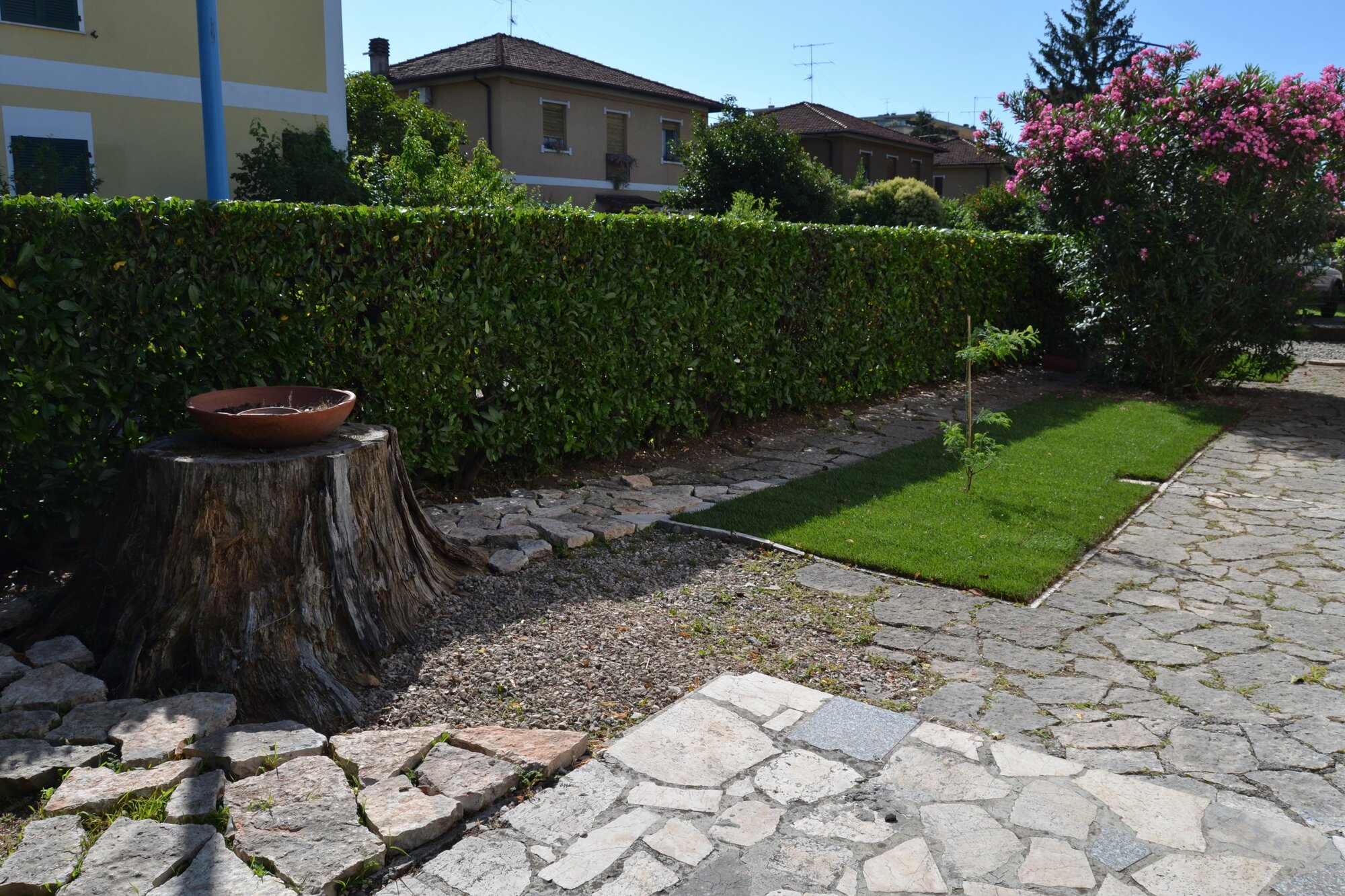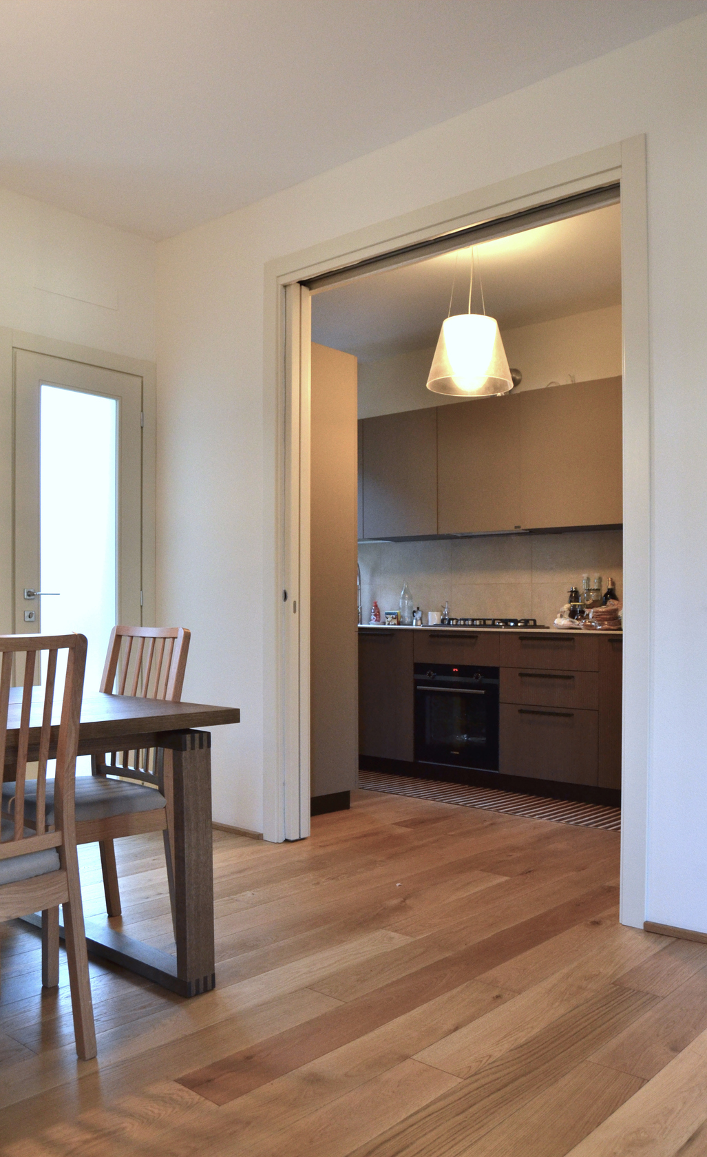 The kitchen is joined to the living room as a single space but is also completely separable thanks to a mobile glass wall. The bathrooms are embellished with mirrored built-in cupboards and panelling that ennoble them despite their small size. The exterior is treated as an English garden, thus as a series of small, self-contained and well-kept parts that form a unitary whole.