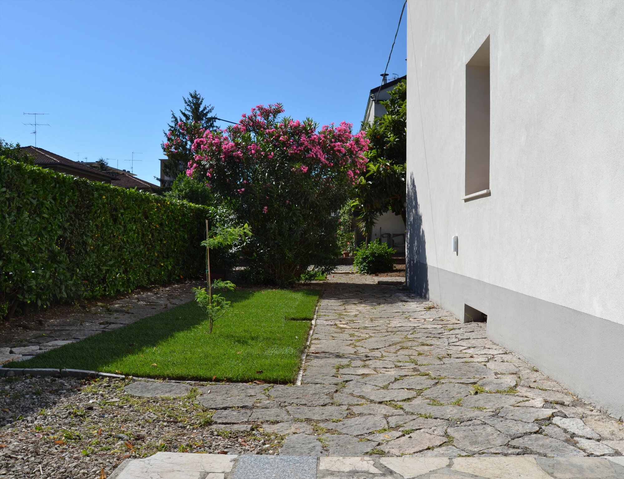 La cucina è unita al soggiorno in un unico ambiente ma è anche completamente separabile grazie ad una parete vetrata mobile. I bagni sono impreziositi da armadi ad incasso a specchio e rivestimenti che li nobilitano nonostante le dimensioni contenute. Il giardino è trattato come uno spazio all’inglese, come cioè una serie di piccole parti autonome e curate che costituiscono un tutto.