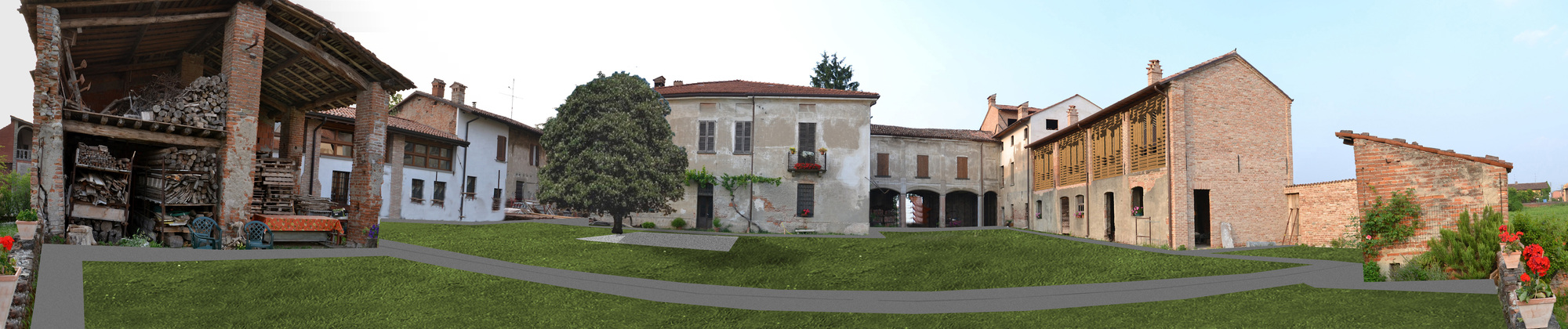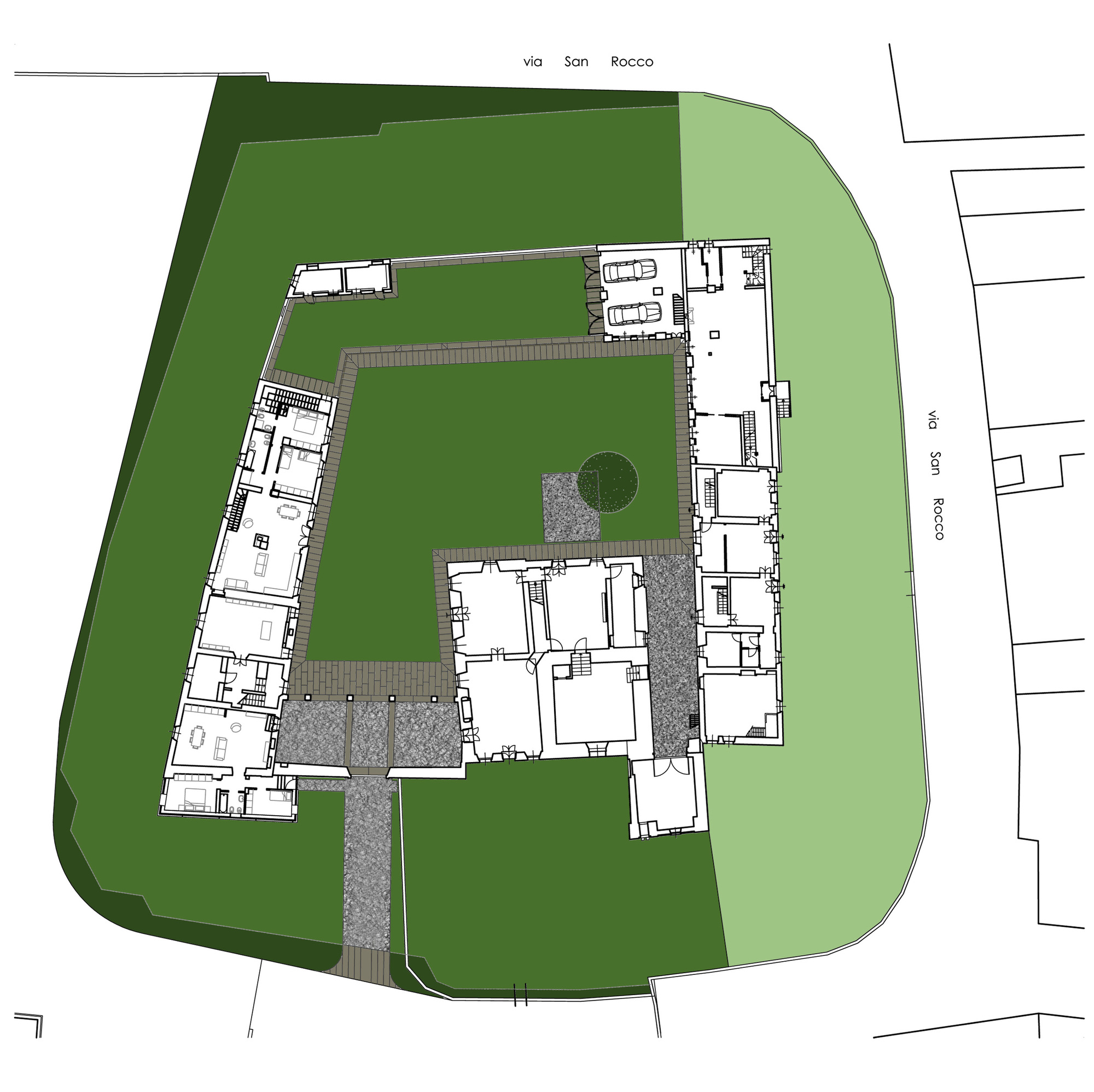 La corte principale, trattata come un giardino interno a servizio delle abitazioni, viene ripensata con una pavimentazione che sottolinea la geometria degli spazi e dei volumi costruiti, lasciando la gran parte degli spazi a prato.