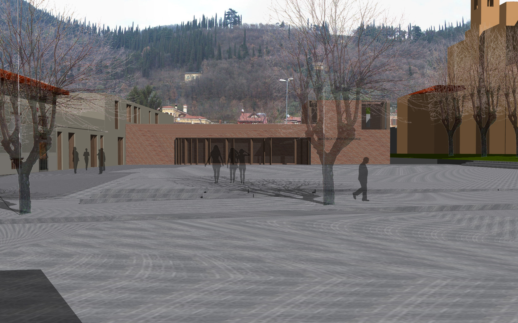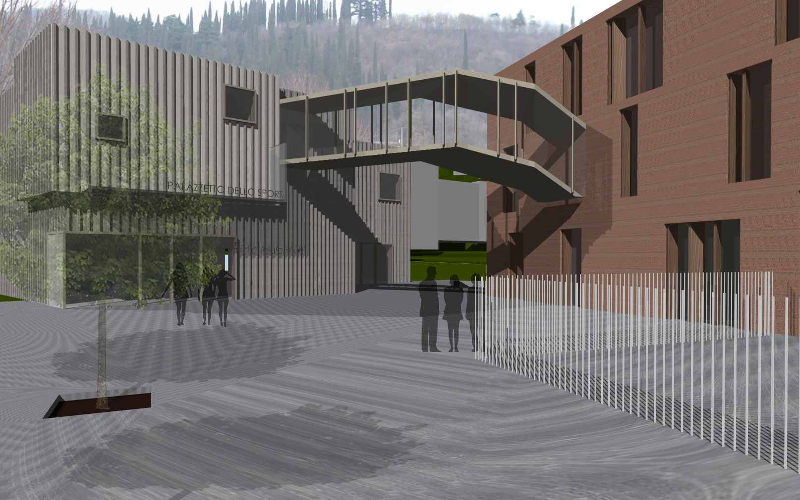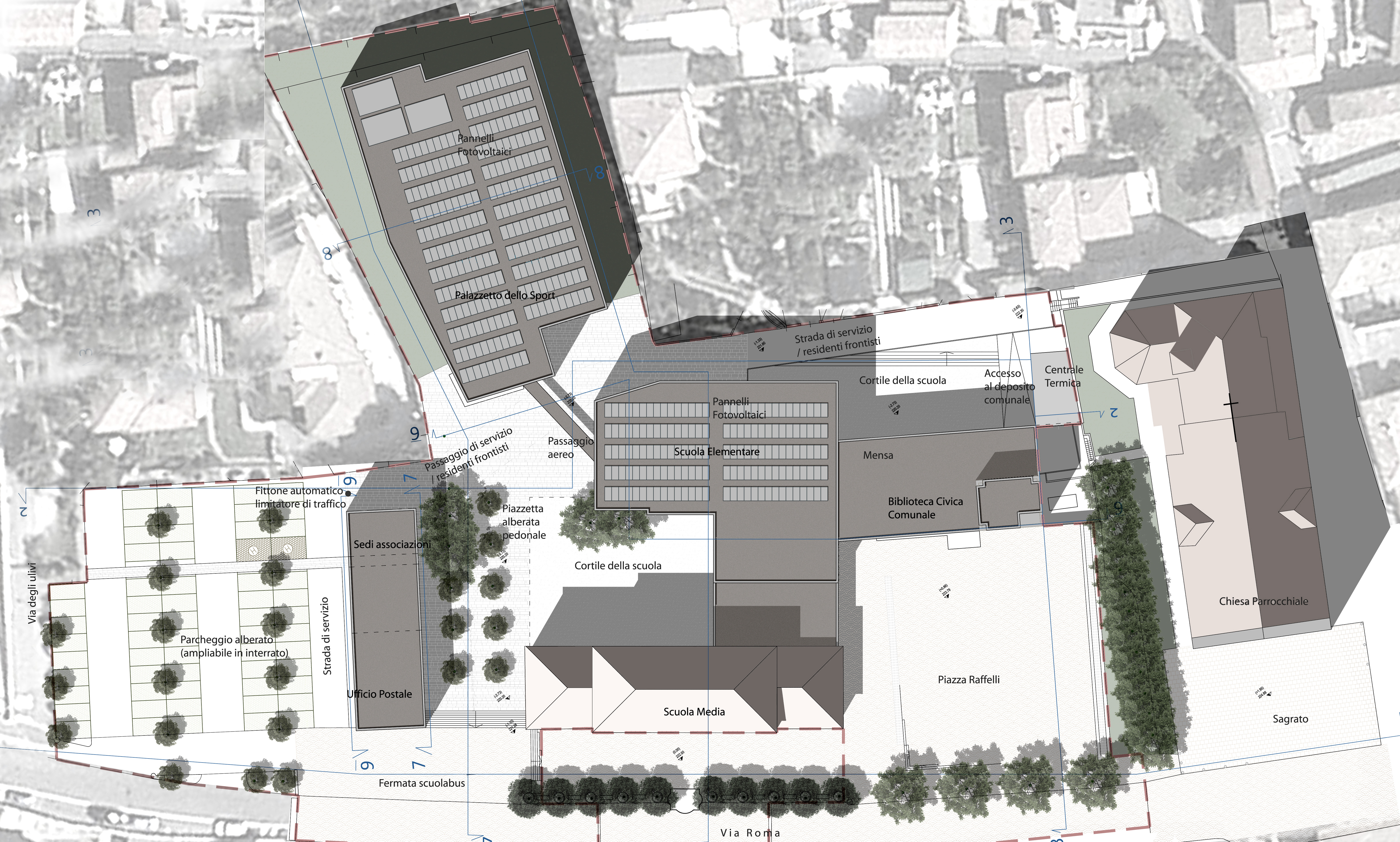 The project is comprises four buildings, which are the schools, the library and canteen, the sports hall / gym and the post office / headquarters of the local associations. There are also four open spaces: two pedestrian squares, one of which is the existing enlarged Piazza Raffelli, the school yard and the parking area of the entire complex.