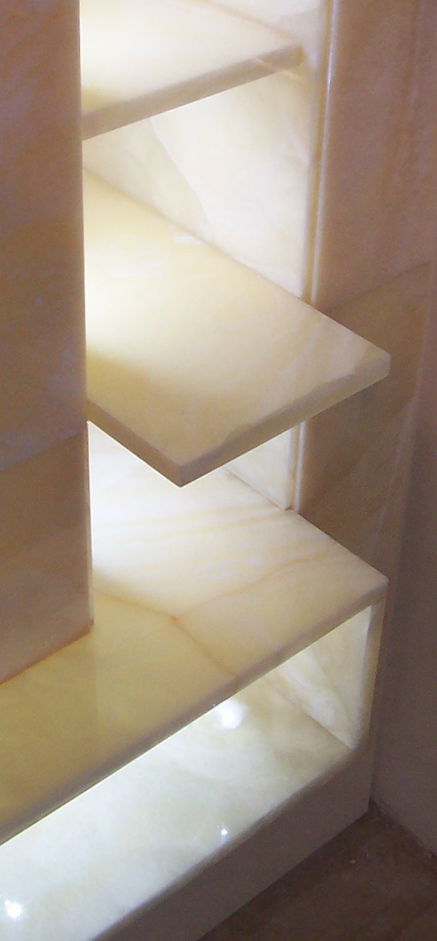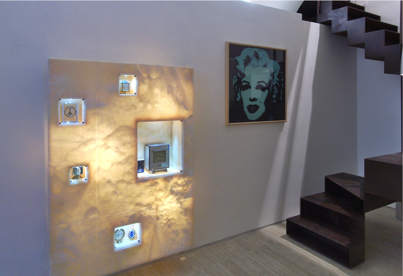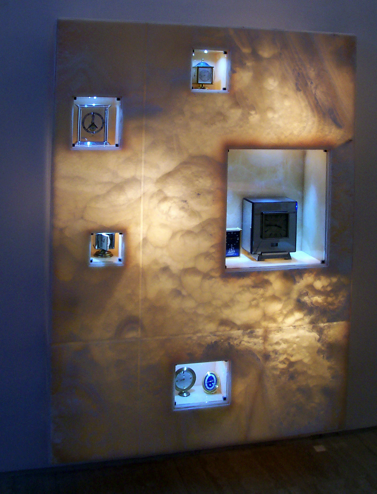 Gli orologi sono esposti in teche di pietra onice retroilluminata, per esaltare l’unicità dei pezzi e dell’ambiente.