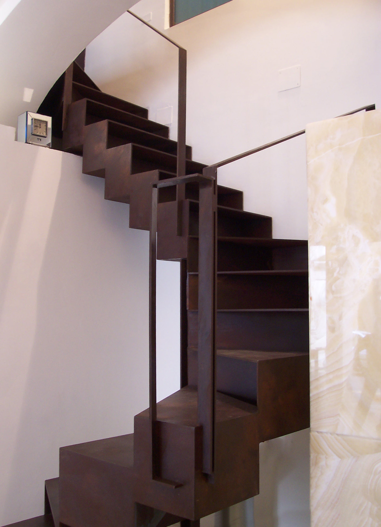 Watches are exposed in excavated cabinets made of inner lighted onyx, designed to exalt the uniqueness of the pieces and the place. A cor-ten steel staircase, made up with cave boxes juxtaposed, leads to the first floor, where there are a studio and a laboratory.