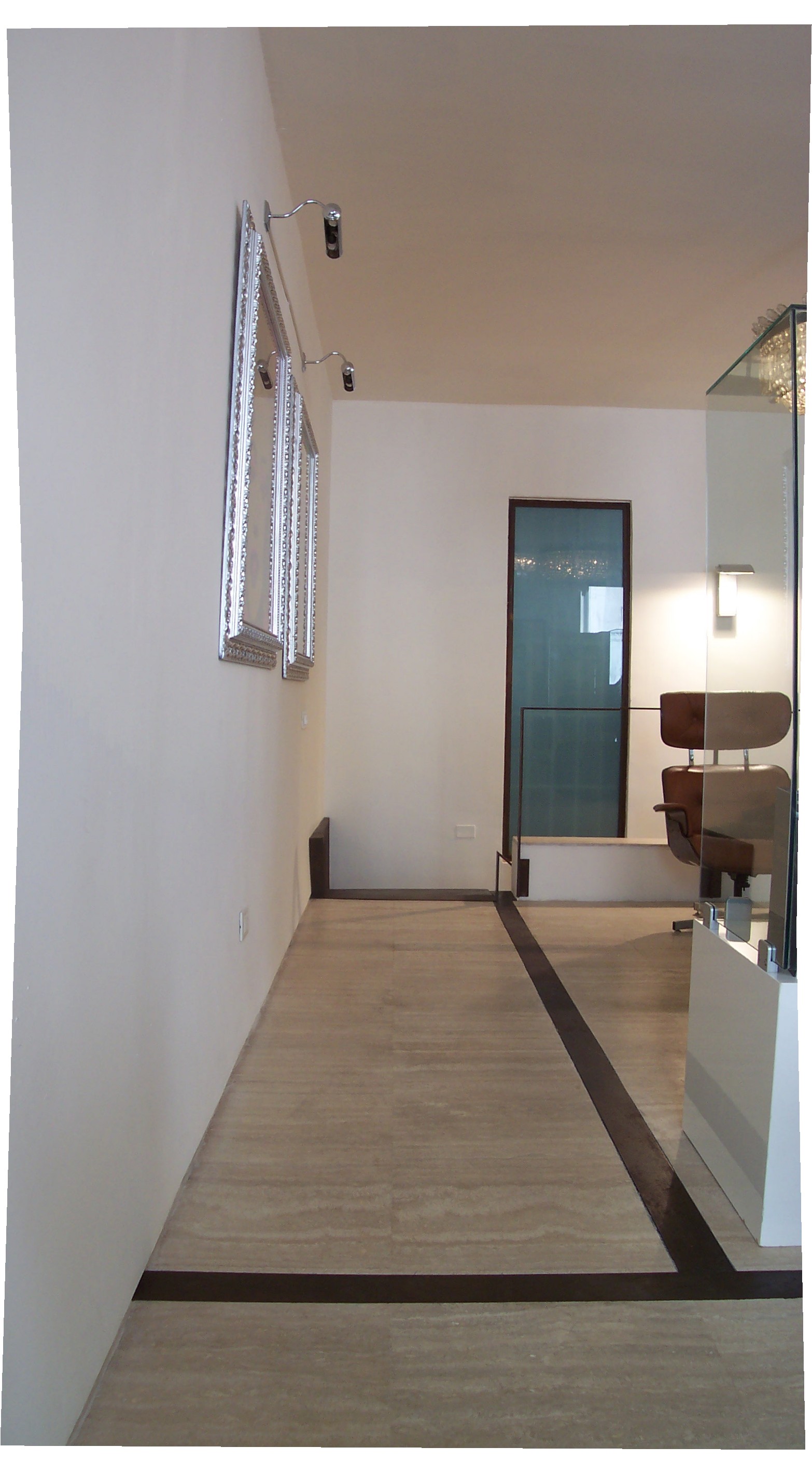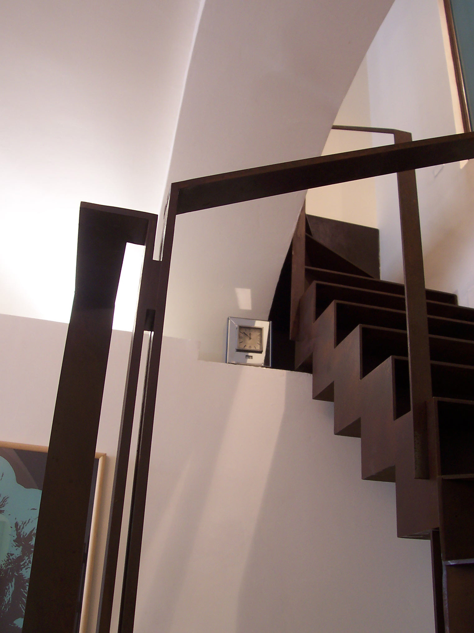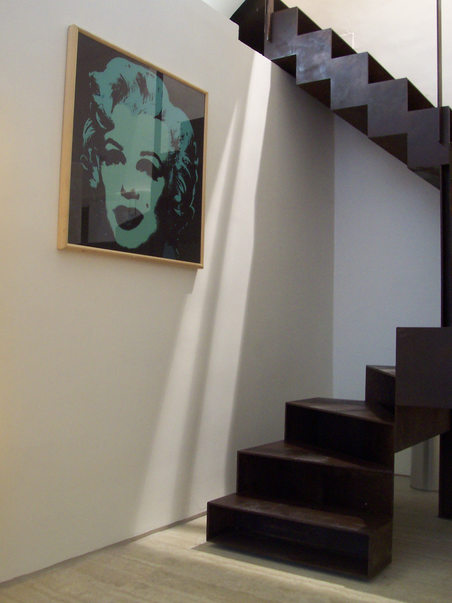 Una scala in acciaio corten, costruita con i gradini come scatole cave giustapposte l’un l’altra, porta al piano superiore, dove vi sono uno studio e un laboratorio. Le linee essenziali degli spazi e degli arredi sono accompagnate da alcune opere d’arte, visibili anche dal passeggio, fra cui quadri di Andy Warhol e di Mario Schifano.