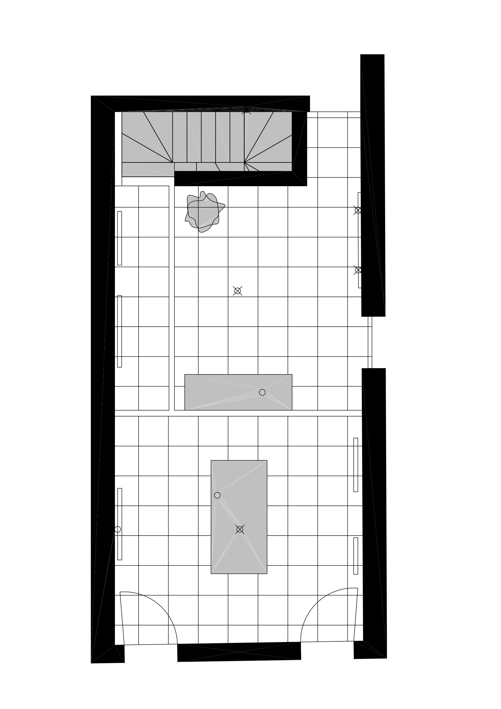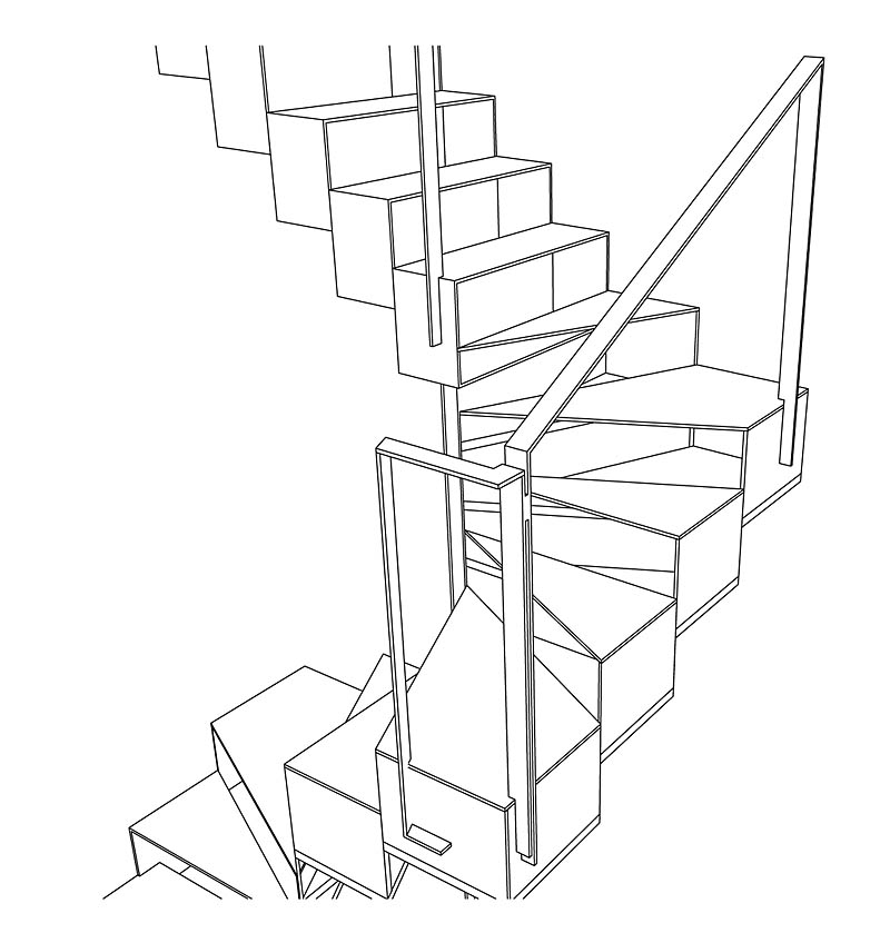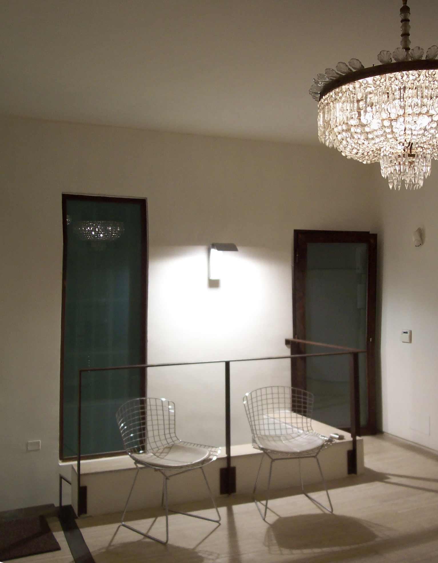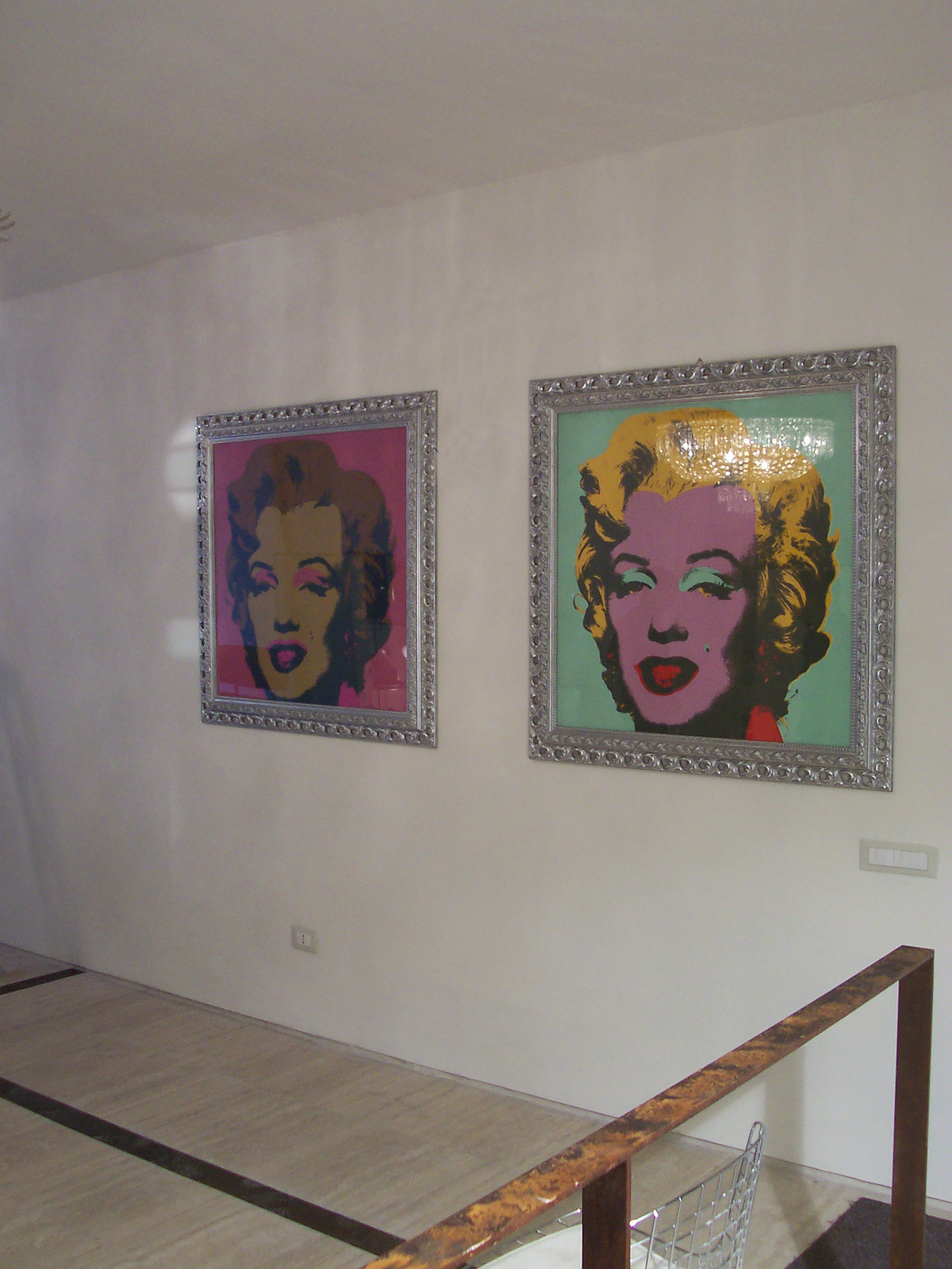 Una scala in acciaio corten, costruita con i gradini come scatole cave giustapposte l’un l’altra, porta al piano superiore, dove vi sono uno studio e un laboratorio. Le linee essenziali degli spazi e degli arredi sono accompagnate da alcune opere d’arte, visibili anche dal passeggio, fra cui quadri di Andy Warhol e di Mario Schifano.