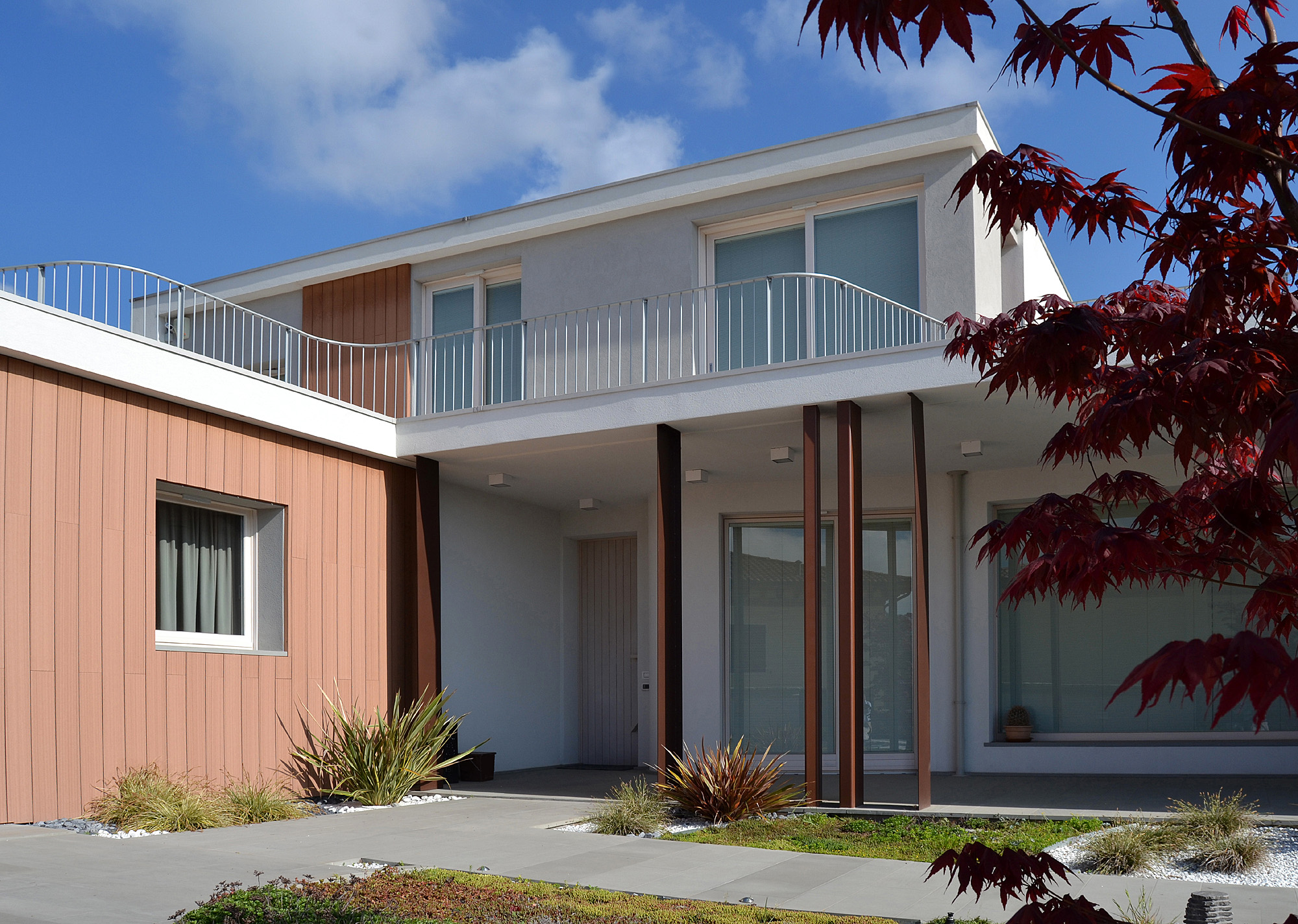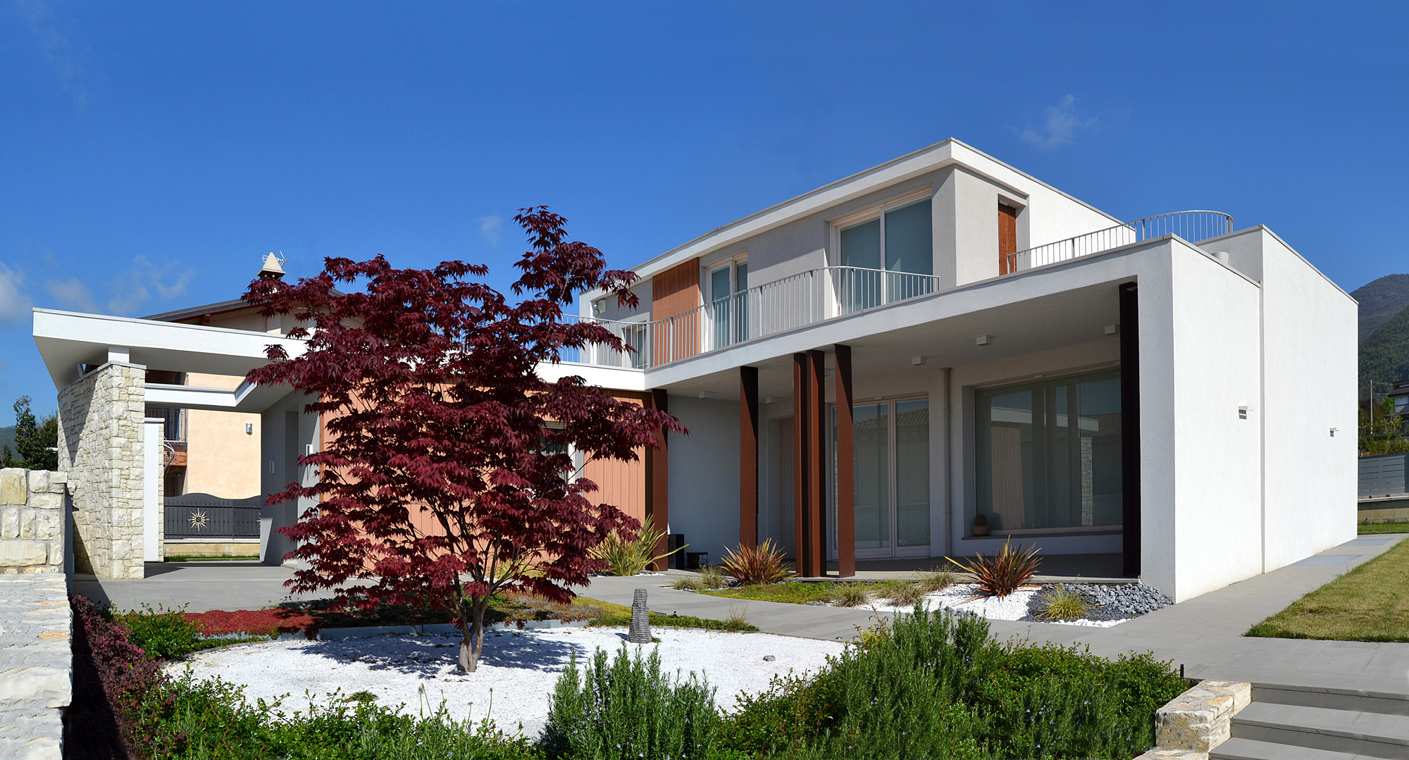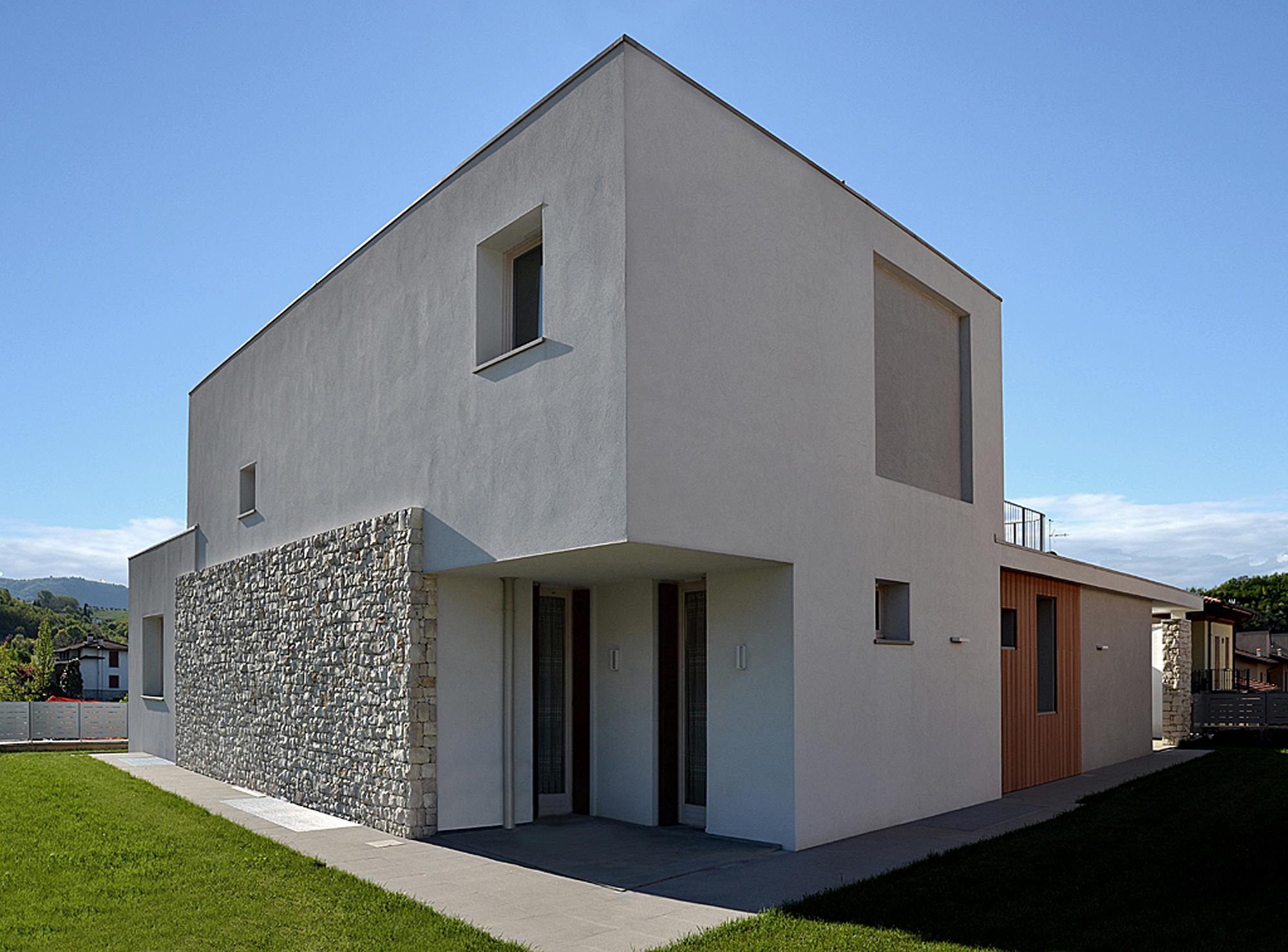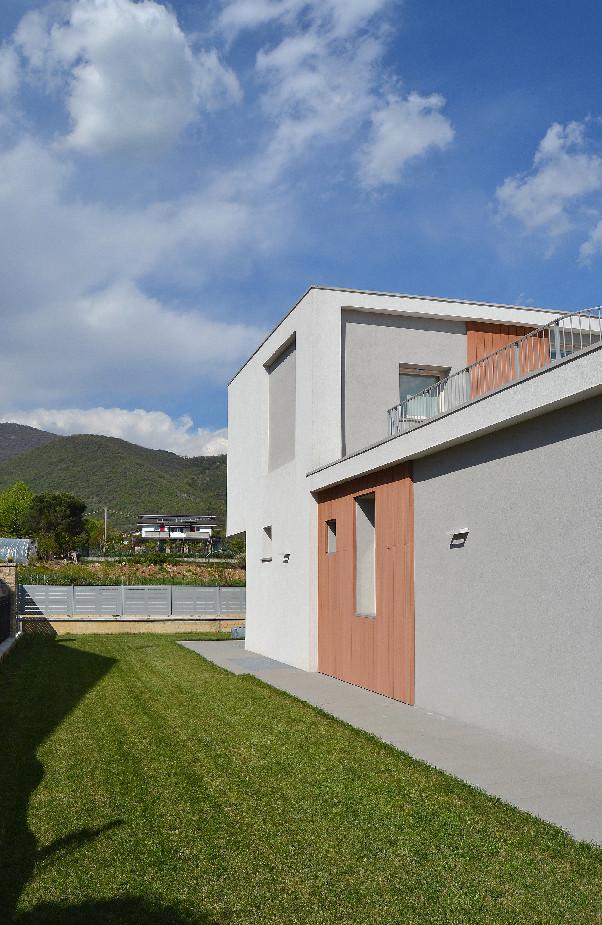 Villa II was specifically born from the needs of its inhabitants, built around its internal spaces through the presence of the architectural elements, the relationship between spaces and landscape, the nature of materials and the quality of light. The plot is in an urban area of recent realization. The entire area is conceived as a series of isolated objects with no notable relationship between each other. As a consequence the house tries to refer more to the elements of the landscape, such as hills and distant significative historical buildings, rather than to its built neighbours. The ground floor is closed in a walled garden, that gives privacy from the street and adjacent plots, allowing views towards the hills and the landscape. The first floor is characterized by decks with great views through the landscape. The living room, separated from the garden through the porch and a glass wall, creates a proper ambiance for relax giving at the same time the feelings of protection and freedom. Protection and freedom are the two main feelings that inspired the design of the house.