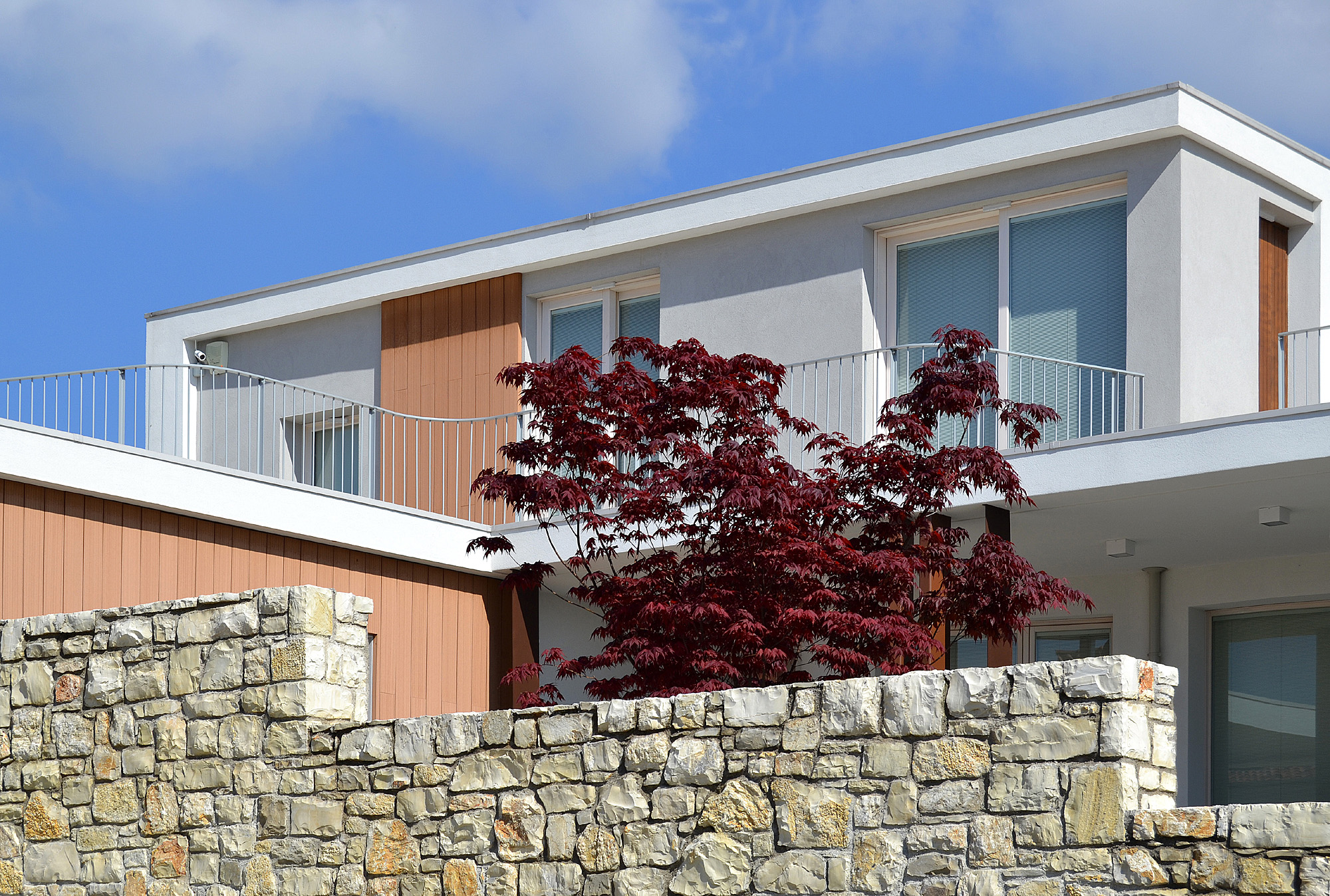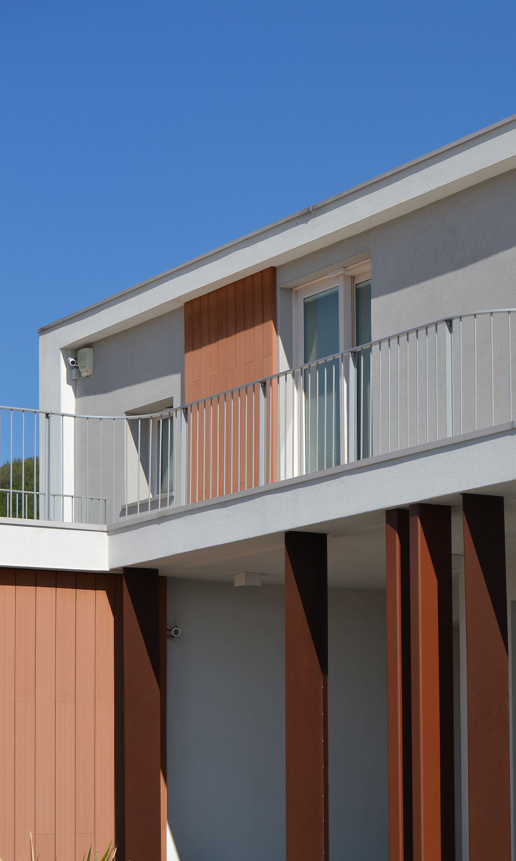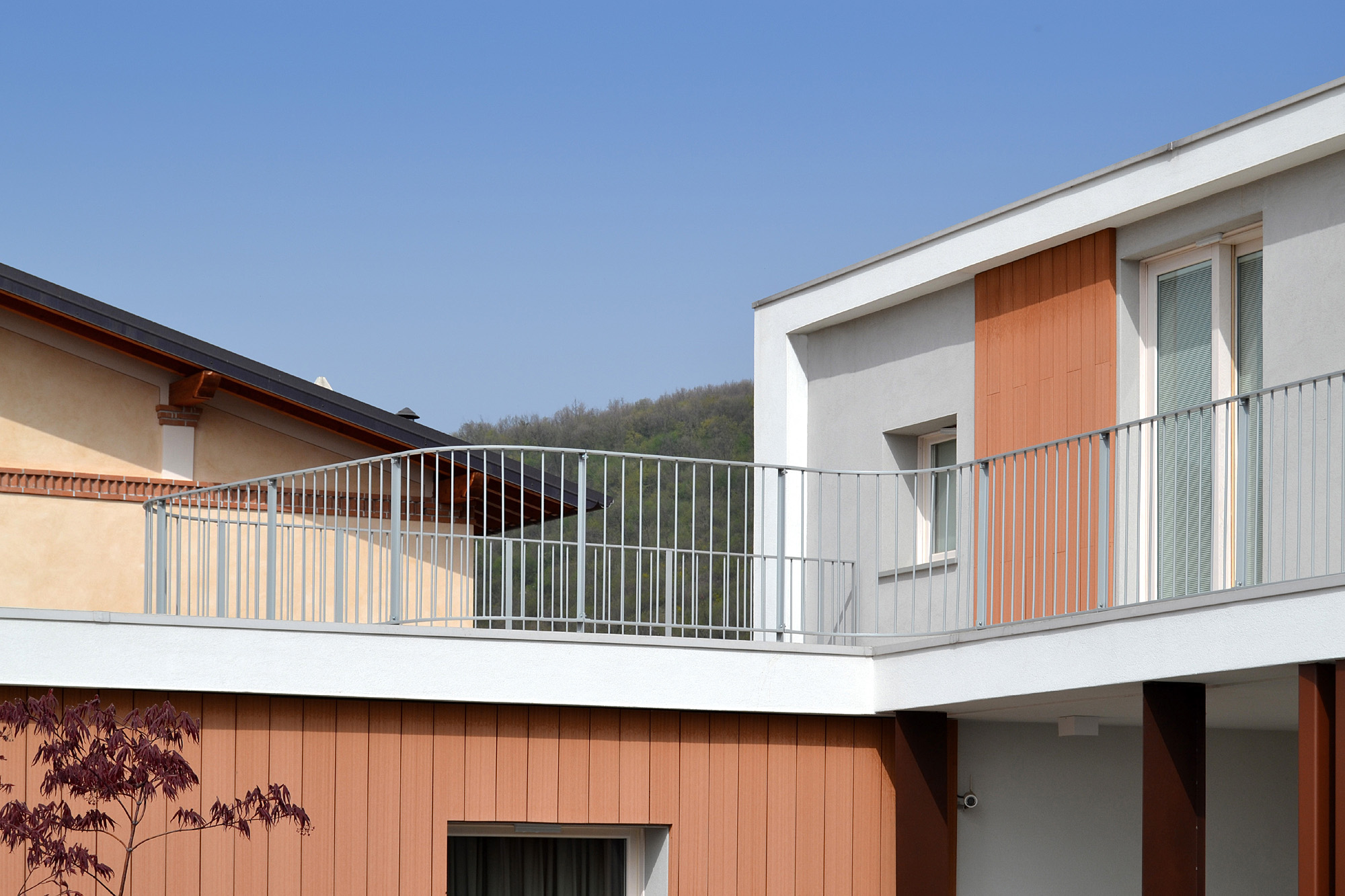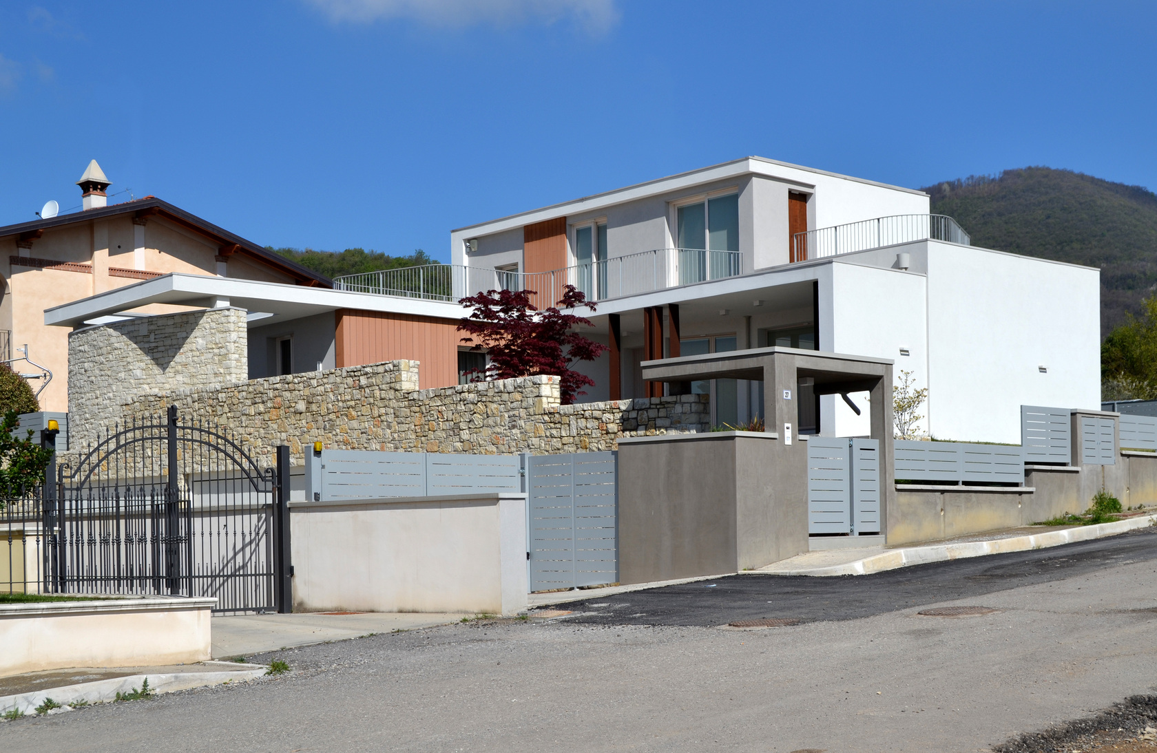 Villa II was specifically born from the needs of its inhabitants, built around its internal spaces through the presence of the architectural elements, the relationship between spaces and landscape, the nature of materials and the quality of light. The plot is in an urban area of recent realization. The entire area is conceived as a series of isolated objects with no notable relationship between each other. As a consequence the house tries to refer more to the elements of the landscape, such as hills and distant significative historical buildings, rather than to its built neighbours. The ground floor is closed in a walled garden, that gives privacy from the street and adjacent plots, allowing views towards the hills and the landscape. The first floor is characterized by decks with great views through the landscape. The living room, separated from the garden through the porch and a glass wall, creates a proper ambiance for relax giving at the same time the feelings of protection and freedom. Protection and freedom are the two main feelings that inspired the design of the house.