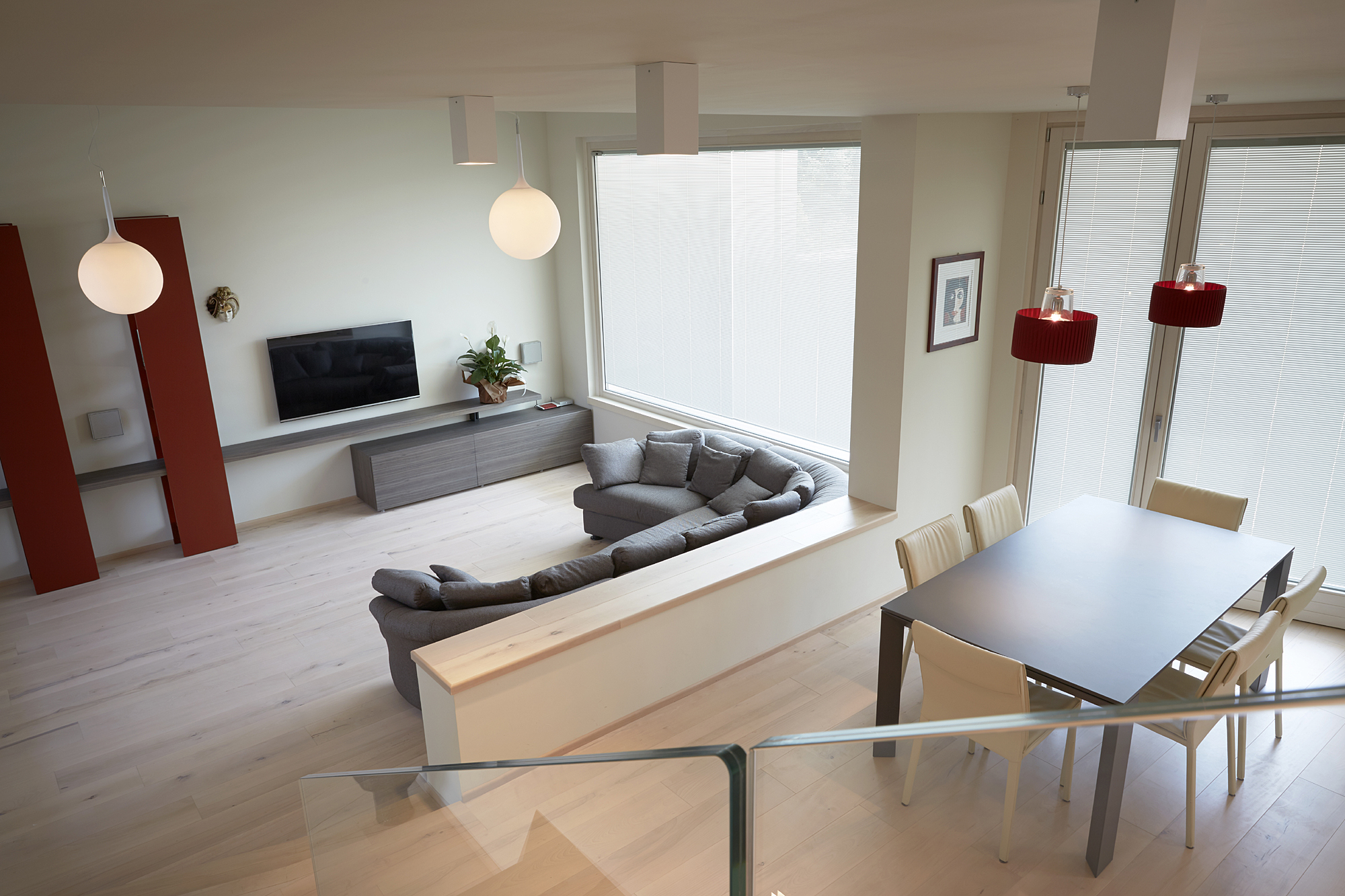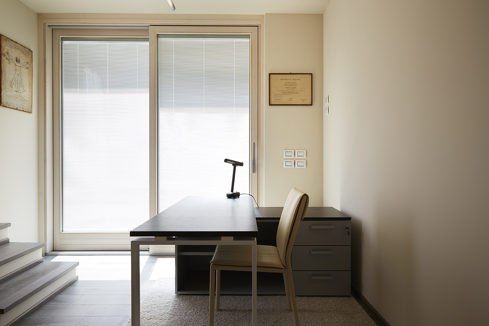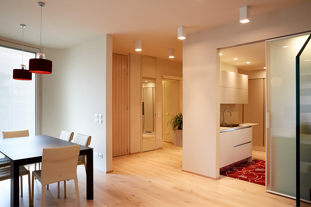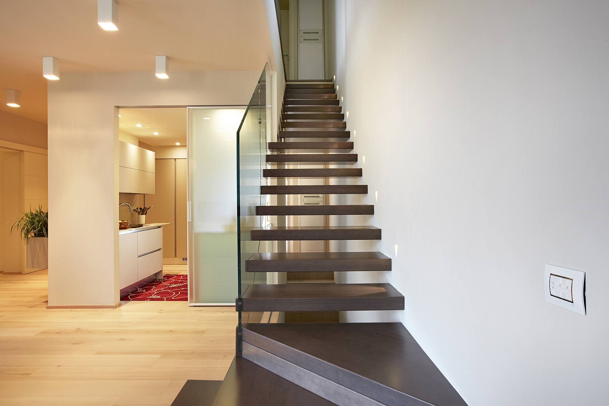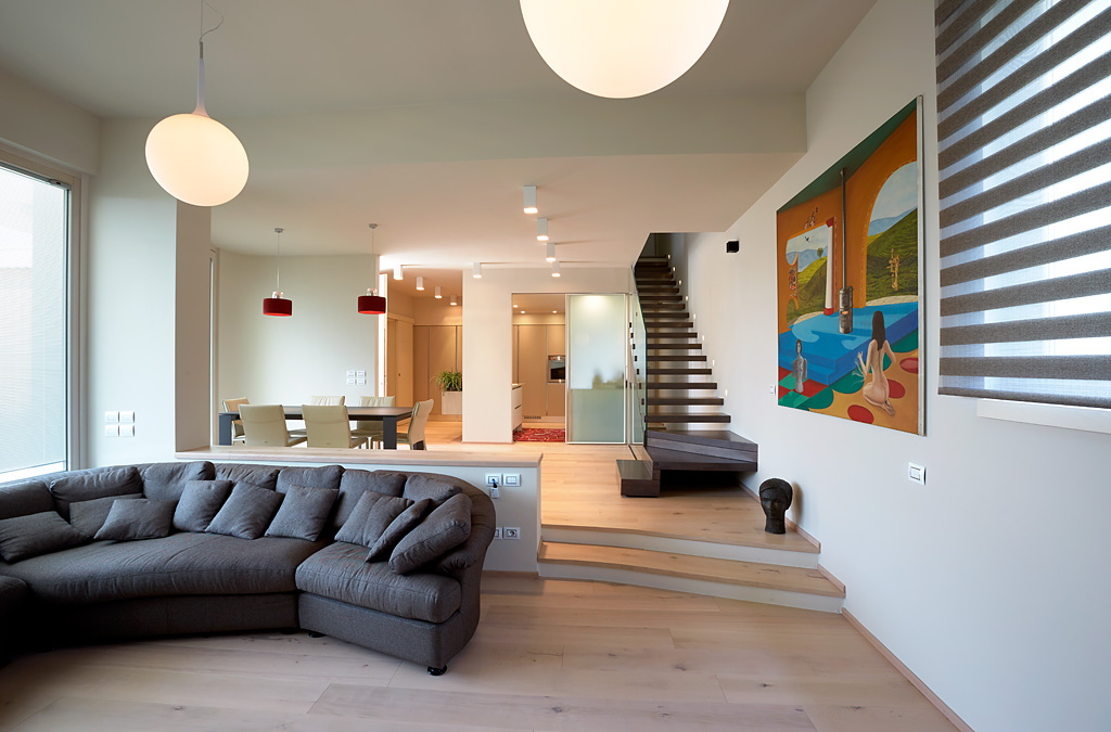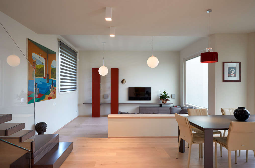 This building is also provided with a complex system of home automation that, based on ABB KNX system, was designed and realized by SEPA Snc. The system allows the complete control, both on site and from remote via tablet or smartphone, of lightning, openings, temperature of different spaces, music, TV, video doorphone etc. It is extremely intuitive and easy to use and customizable.