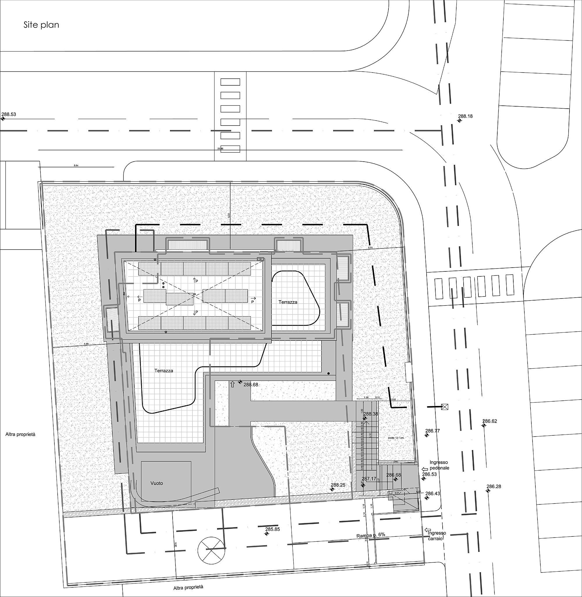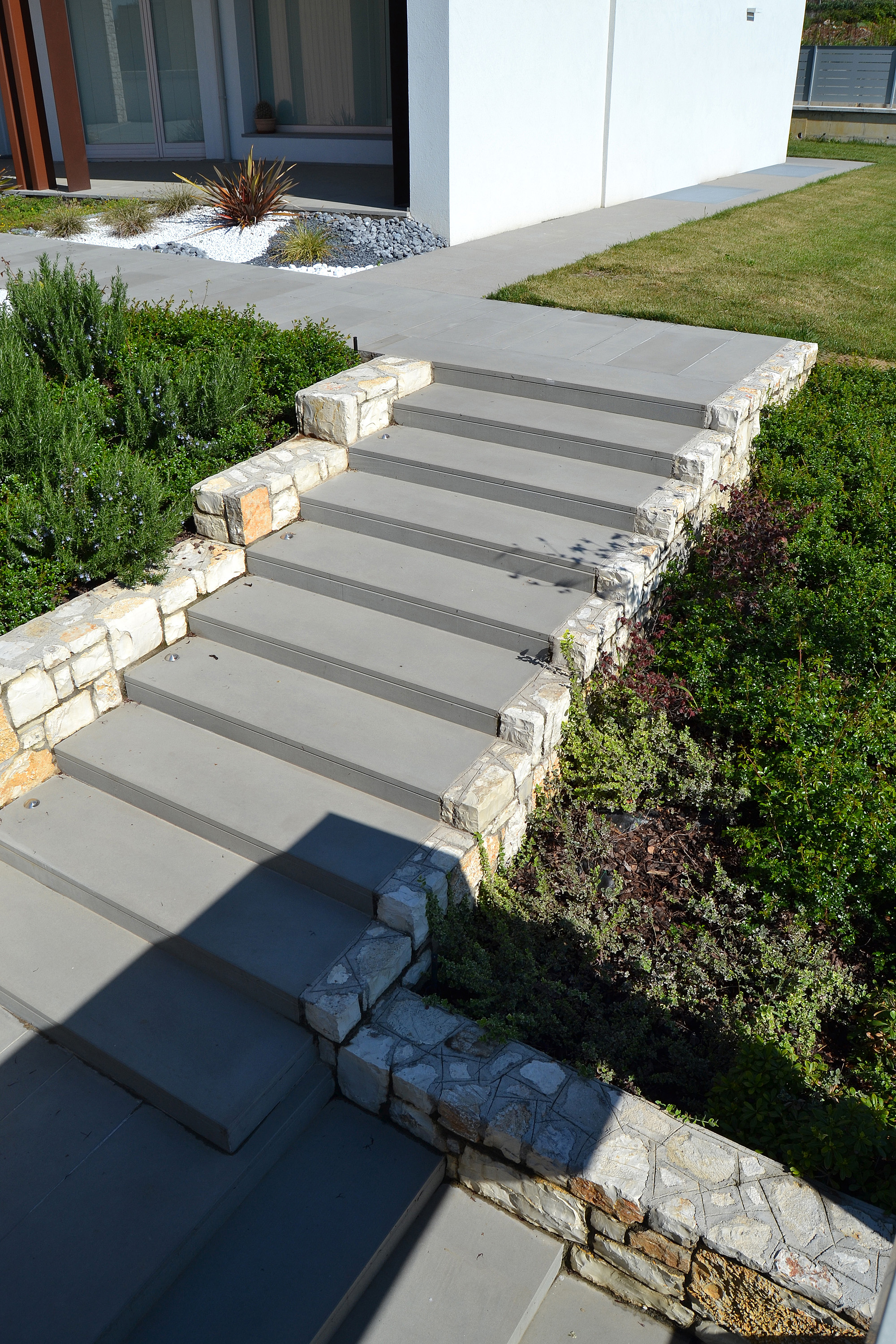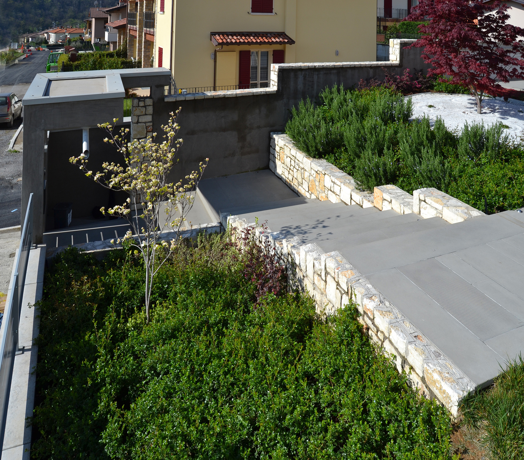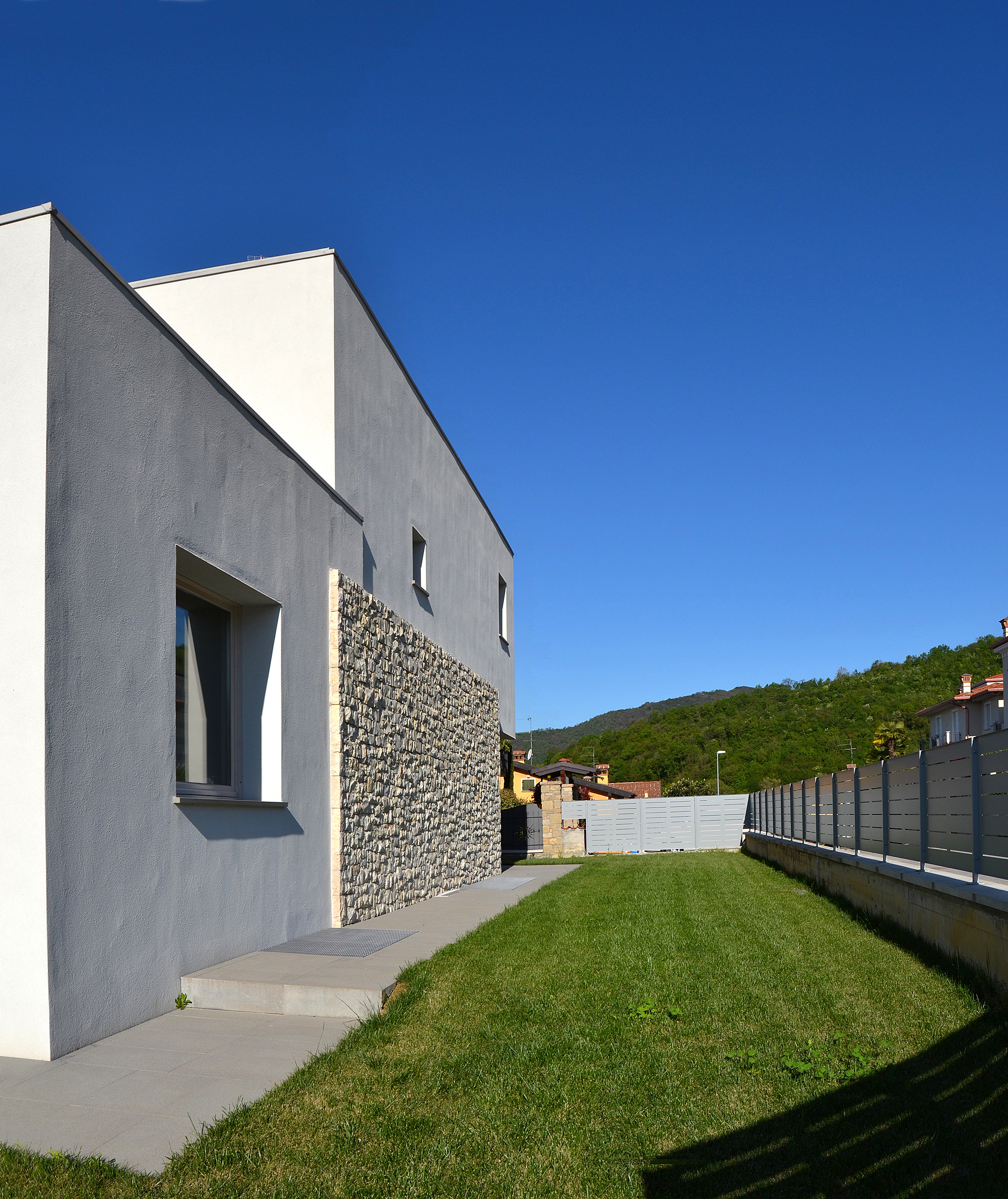 Il lotto su cui sorge è in un’area urbana di recente realizzazione. Il piano terra è chiuso all’interno di un giardino murato, che fornisce privacy rispetto alla strada e ai lotti adiacenti, consentendo le viste verso le colline e il paesaggio.