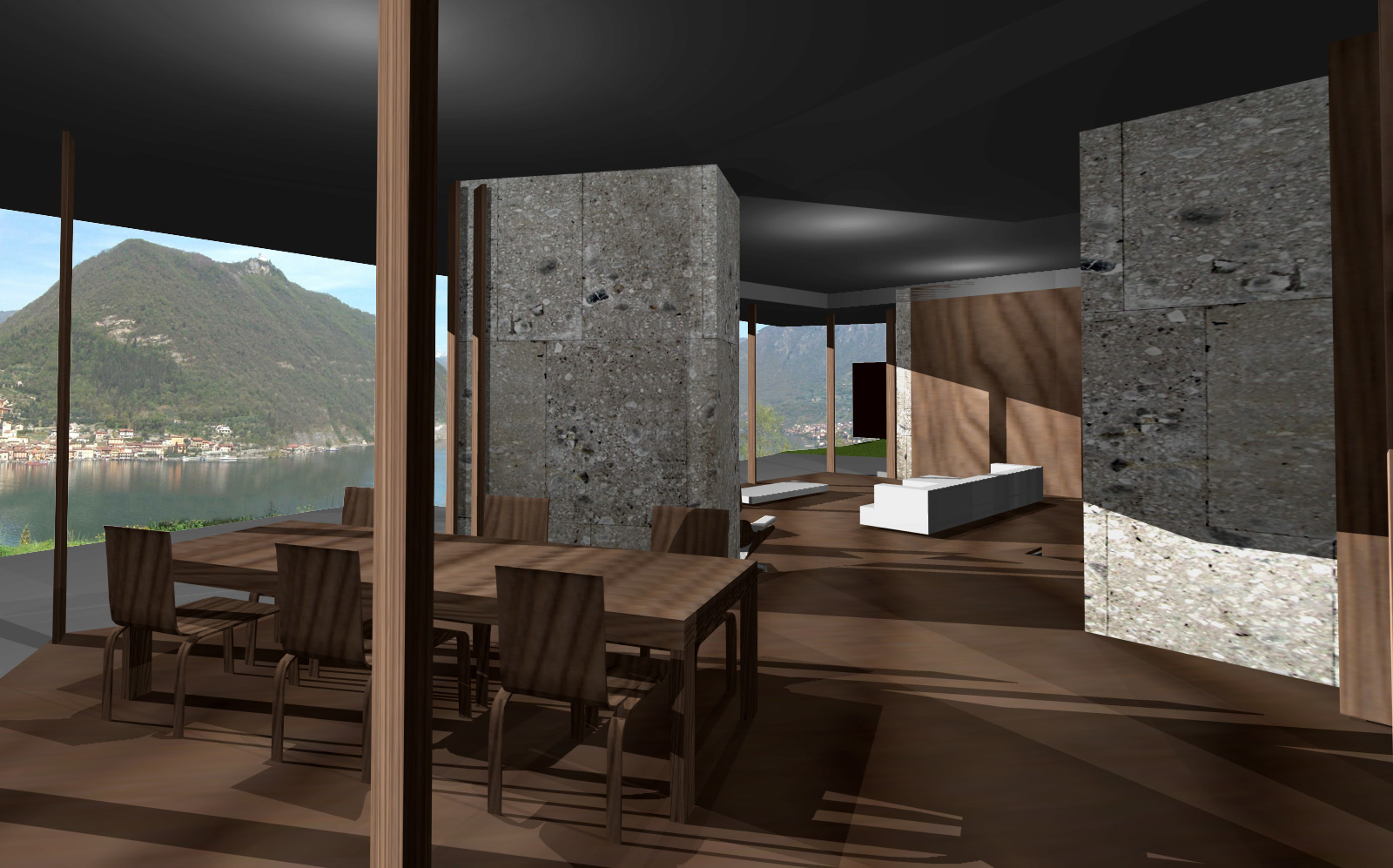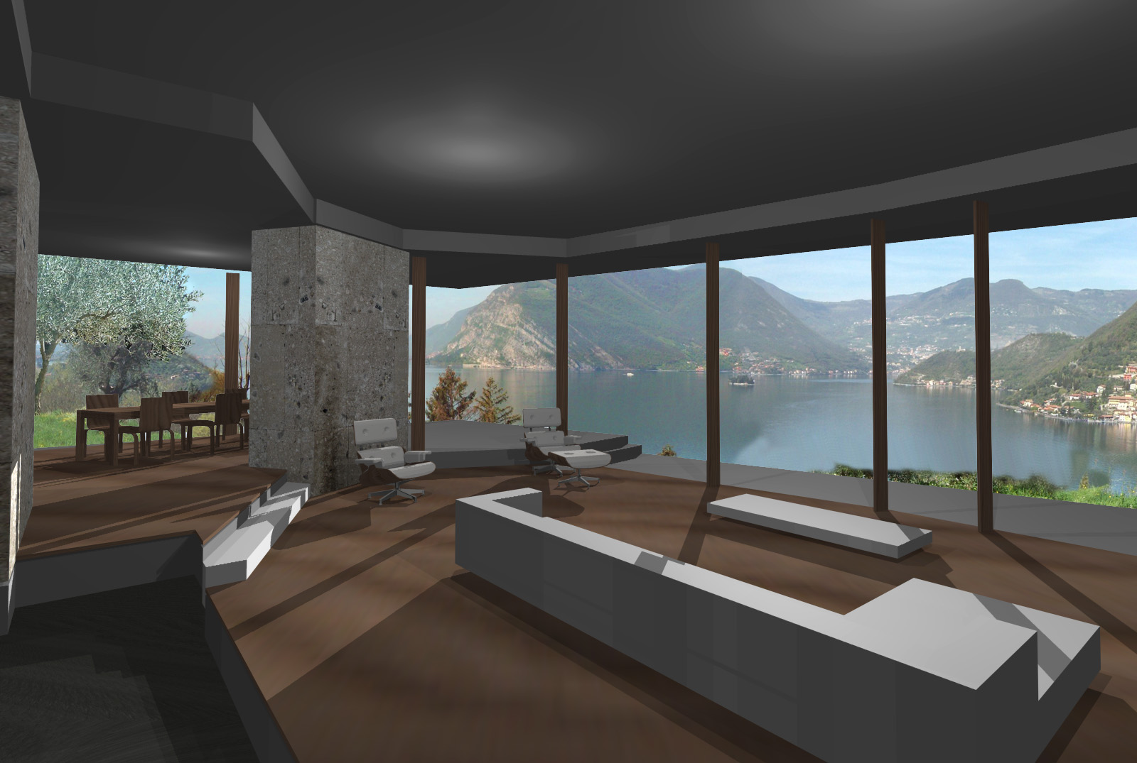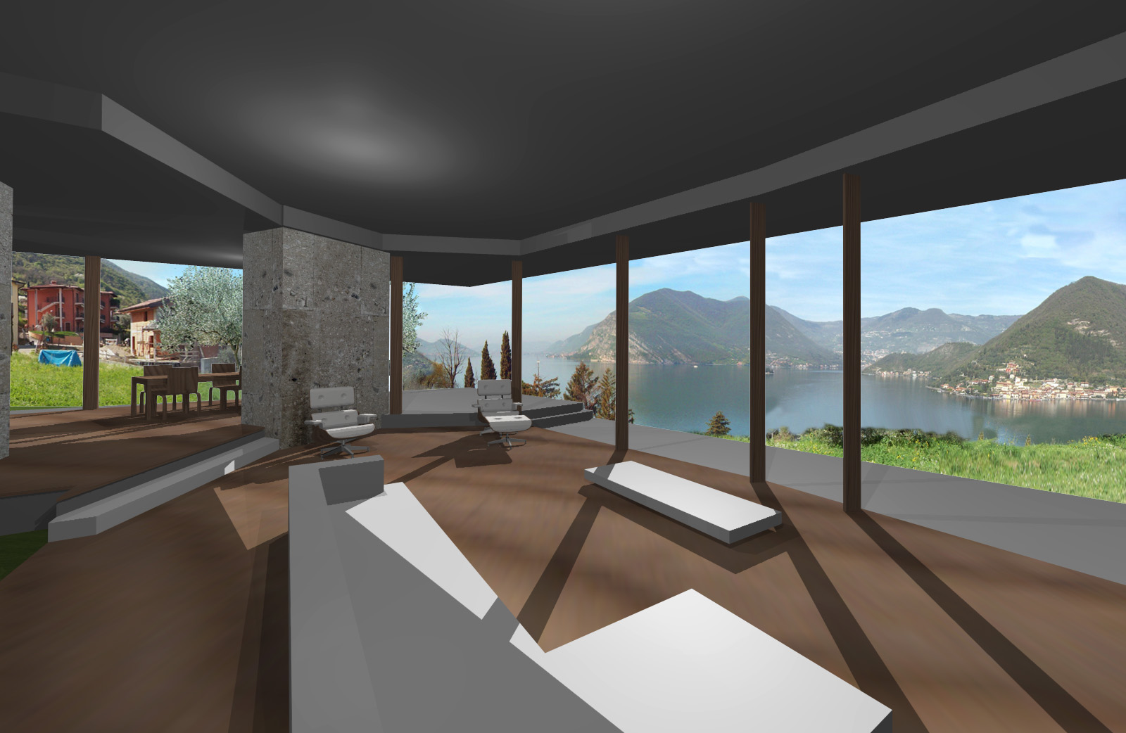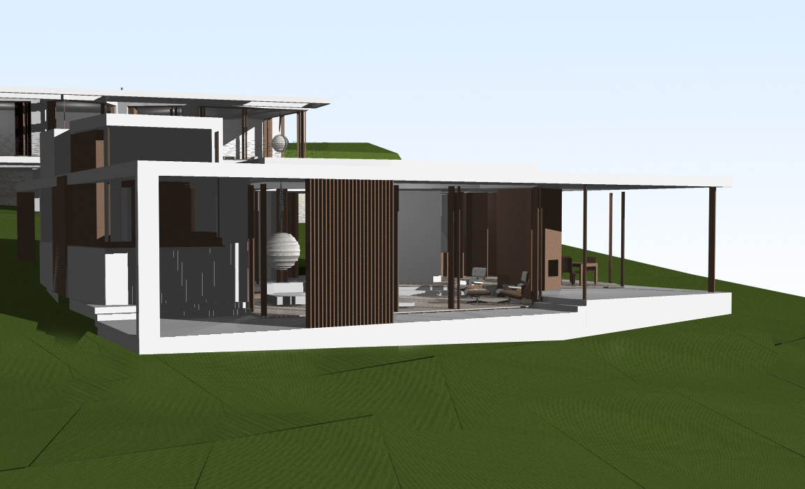 Entrambi i prospetti verso il lago sono trattati a portico, che dà una semplicità lineare al disegno complessivo dei due volumi e consente allo stesso tempo una forma variegata delle facciate in vetro interne, così da esaltare le differenti viste del lago dai vari spazi della casa.