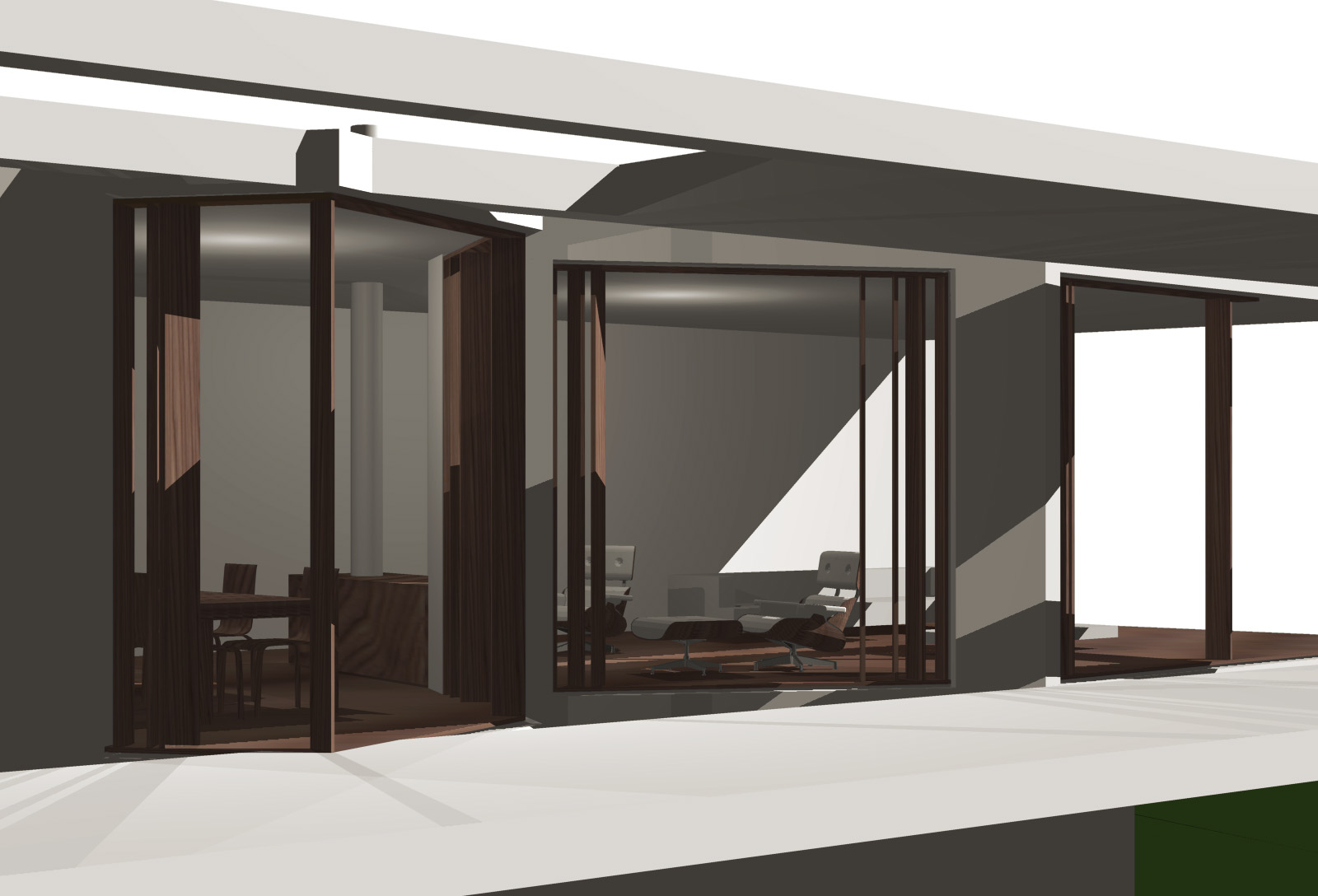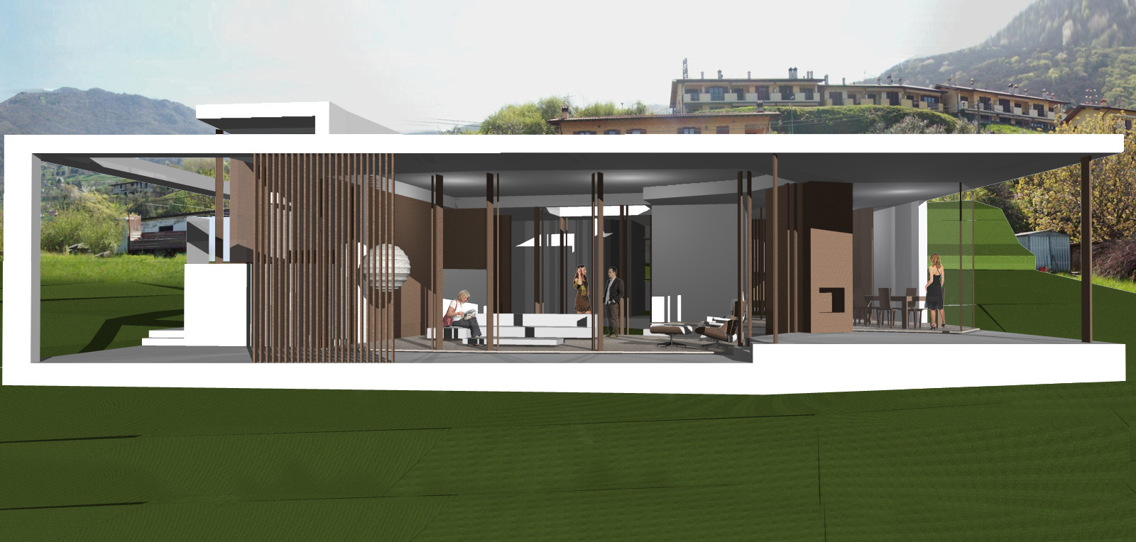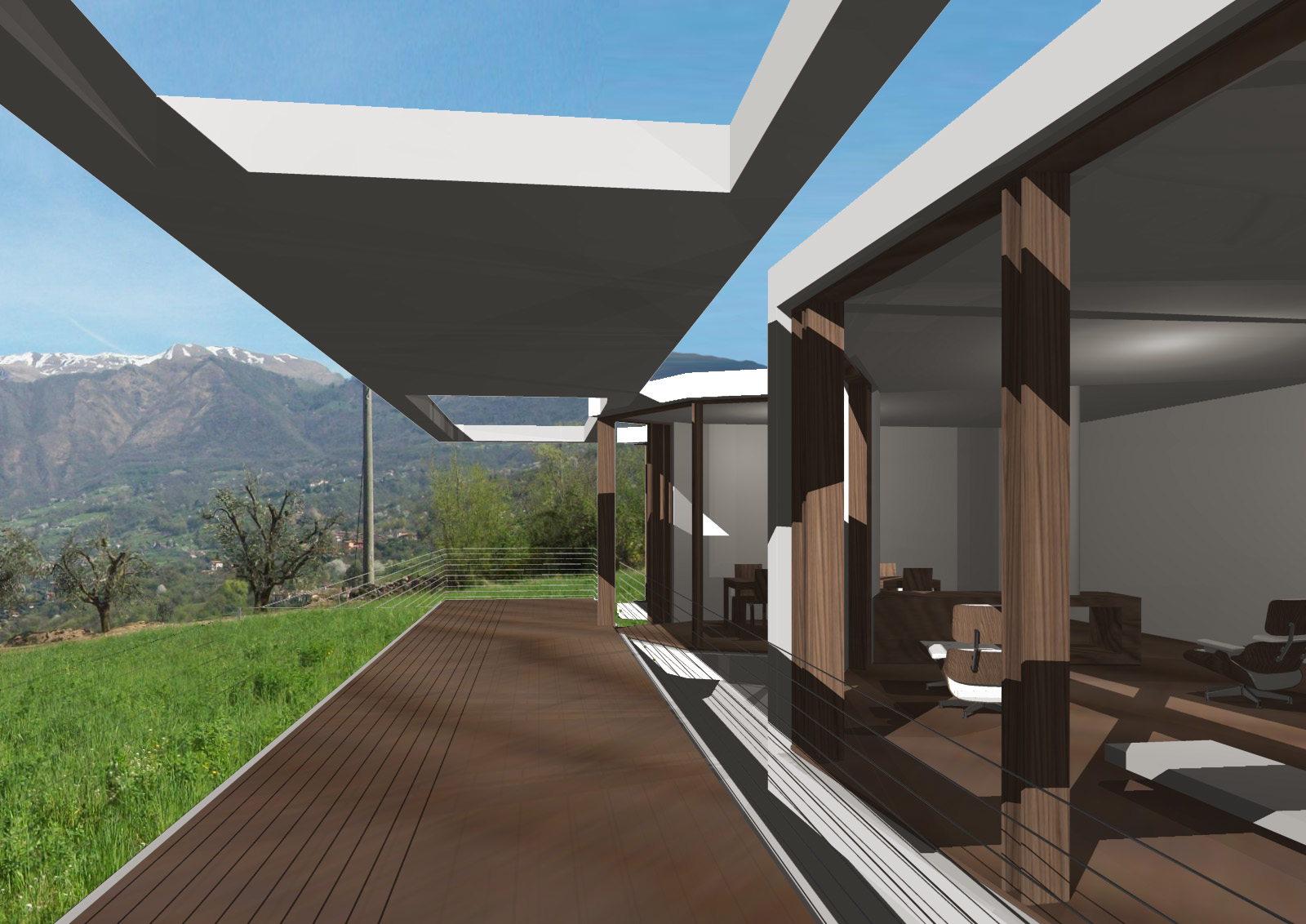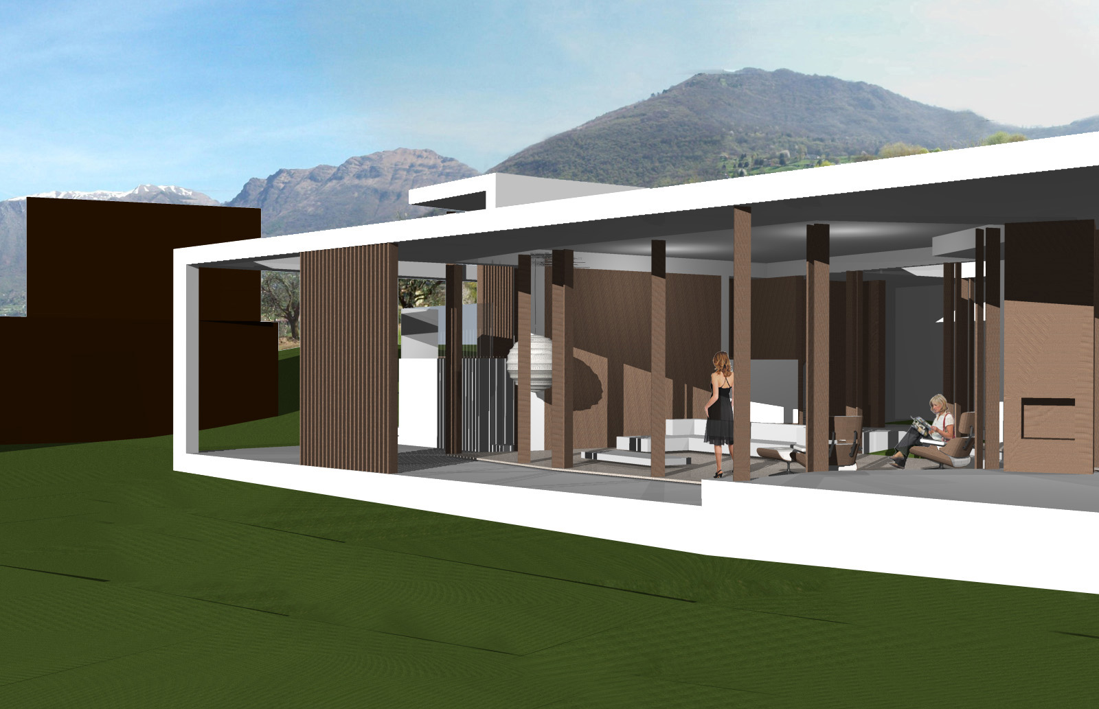 Entrambi i prospetti verso il lago sono trattati a portico, che dà una semplicità lineare al disegno complessivo dei due volumi e consente allo stesso tempo una forma variegata delle facciate in vetro interne, così da esaltare le differenti viste del lago dai vari spazi della casa.