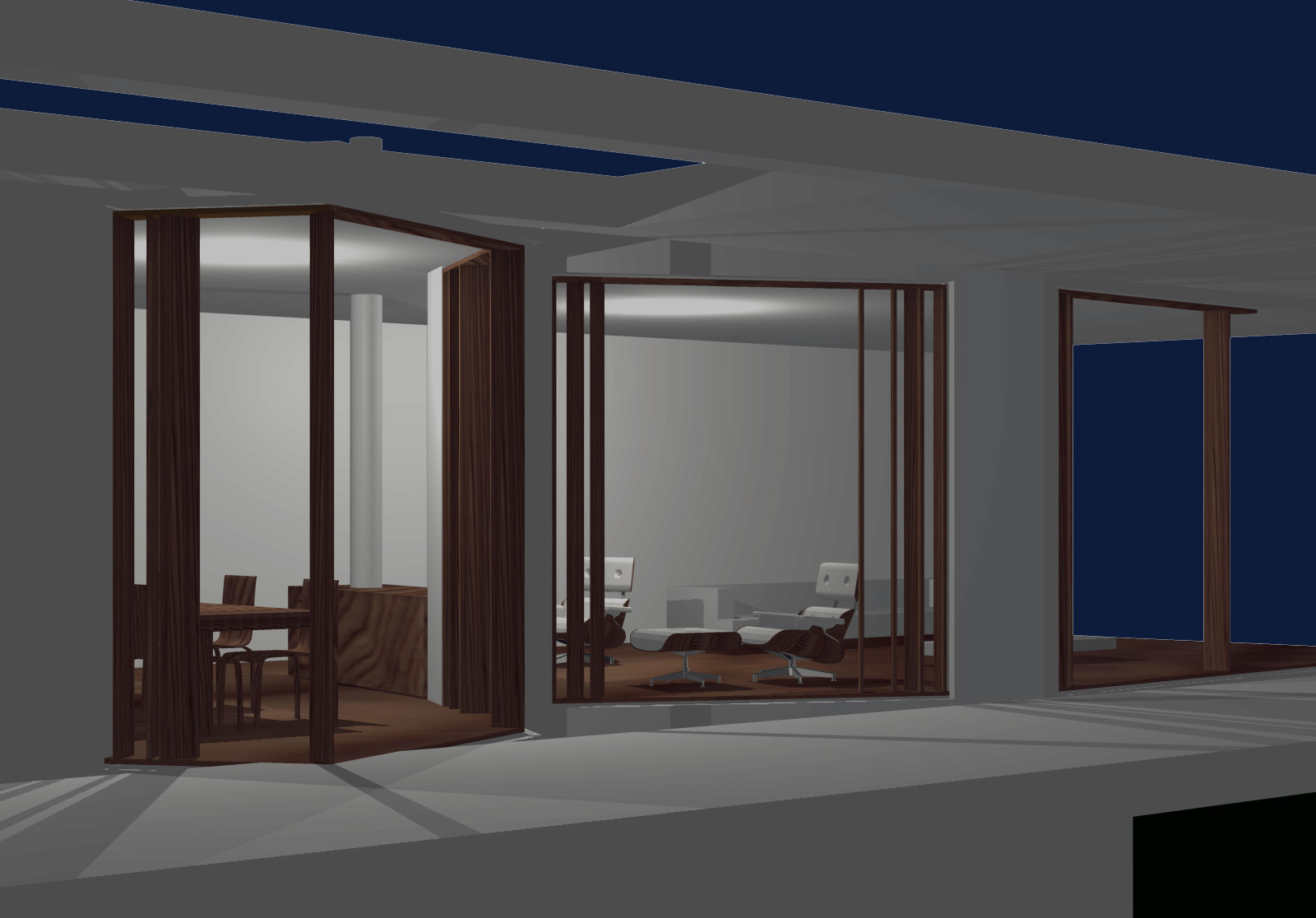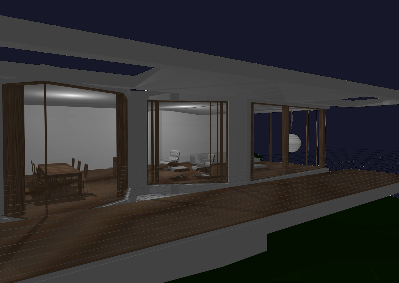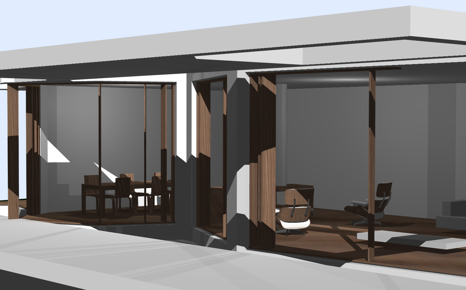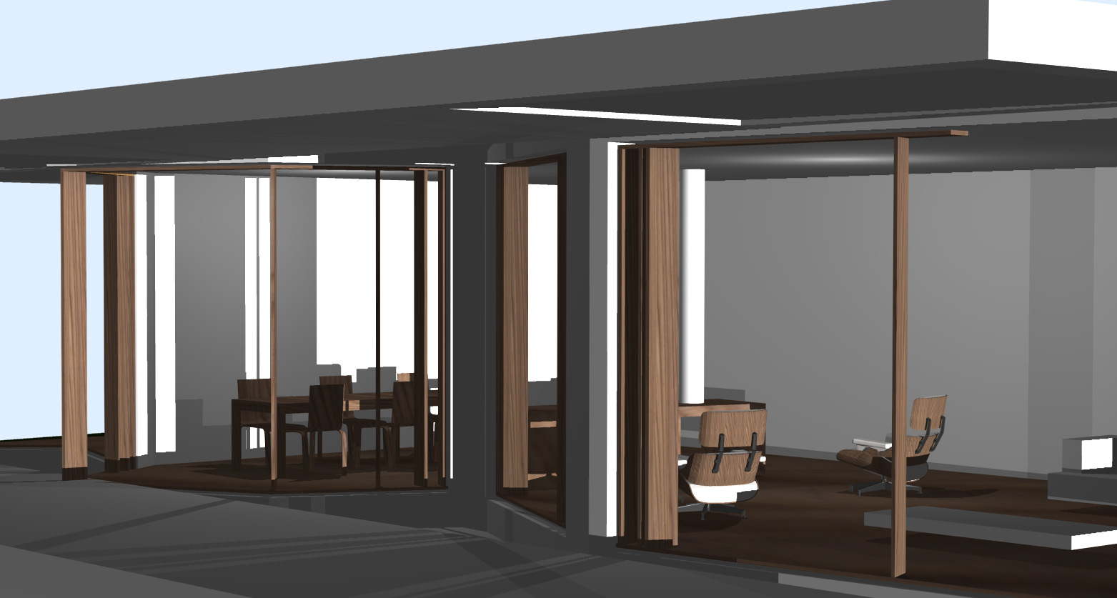 Entrambi i prospetti verso il lago sono trattati a portico, che dà una semplicità lineare al disegno complessivo dei due volumi e consente allo stesso tempo una forma variegata delle facciate in vetro interne, così da esaltare le differenti viste del lago dai vari spazi della casa.