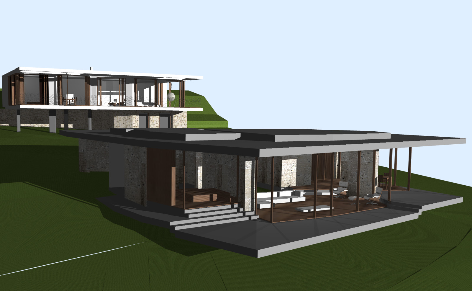 These two houses aim to be like objects immersed in the landscape. The use of natural materials, the simple forms and details give them the stature of ancient noble houses and a contemporary simplicity.