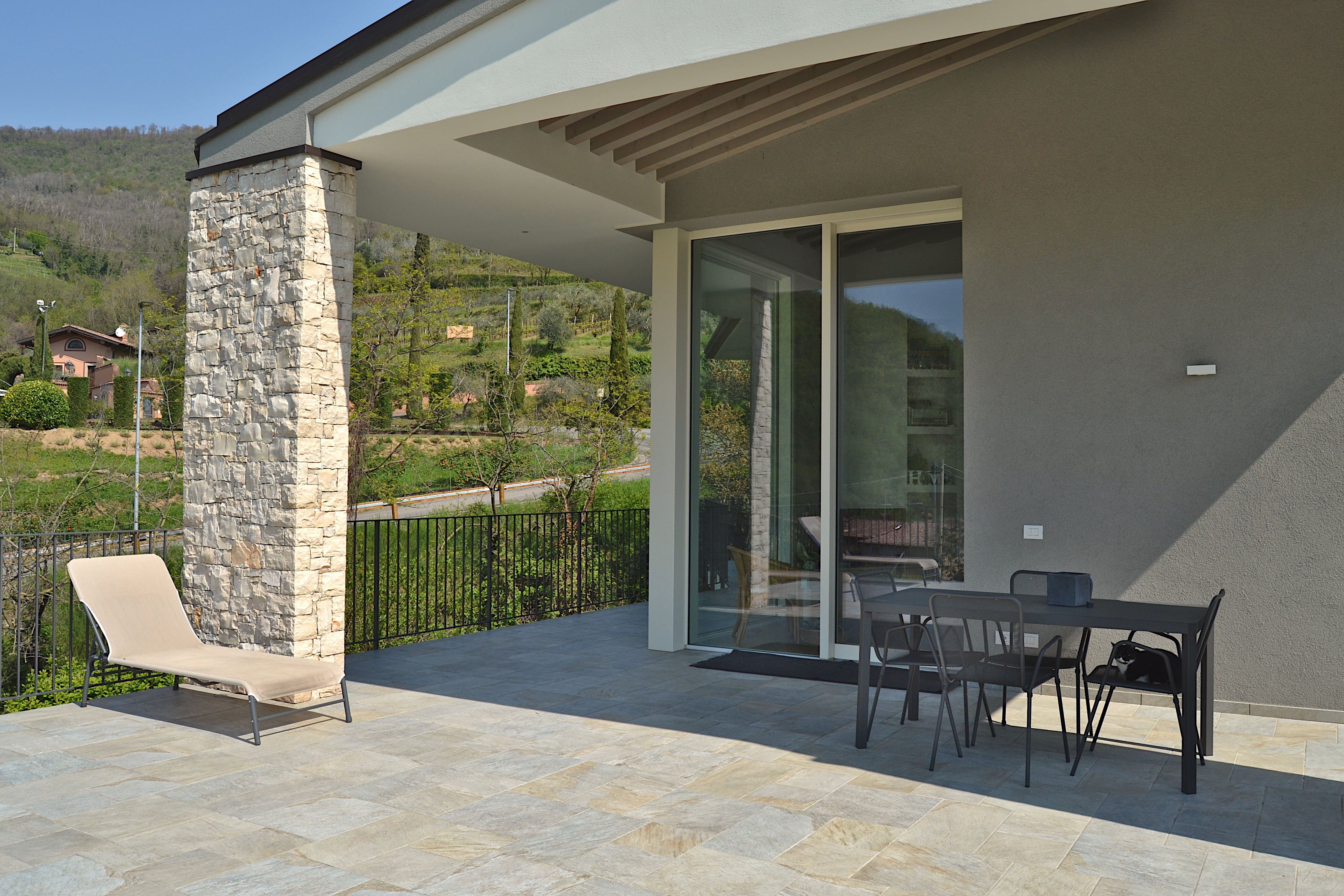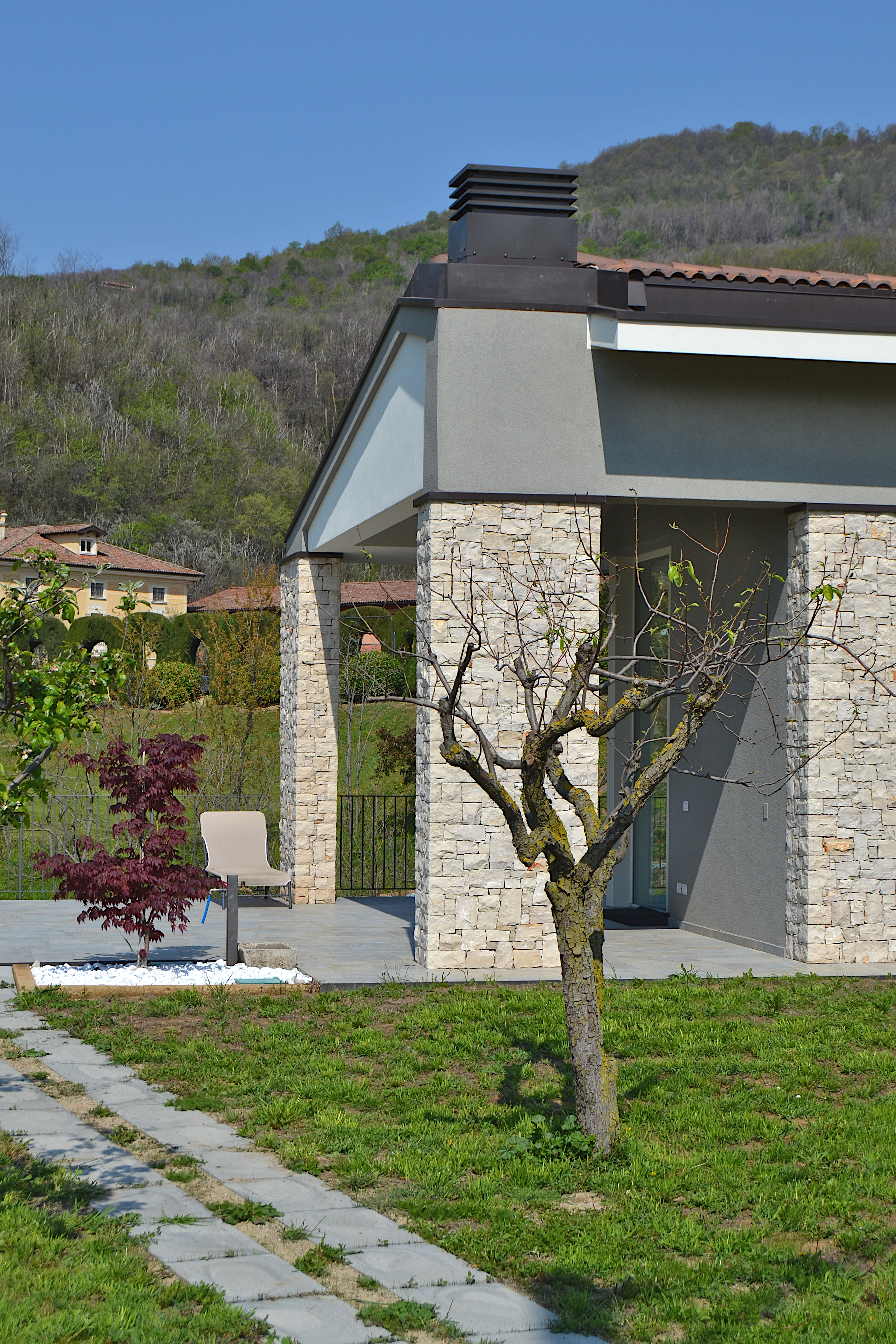The extension focuses on redefining the living and dining spaces, and on giving a new shape and image to the entire house. A great portico becomes the ‘trait d’union’ of the entire composition. The existing building has a pitched roof, like all the houses in the small village of Baiana, so the extension tries to speak the same language while interpretating it in a more contemporary and clean way. Great openings dominate the new volume and define the relationship between the internal spaces and the portico. Natural materials like local split stone, pietra serena and wood dominate the palette used for the project.